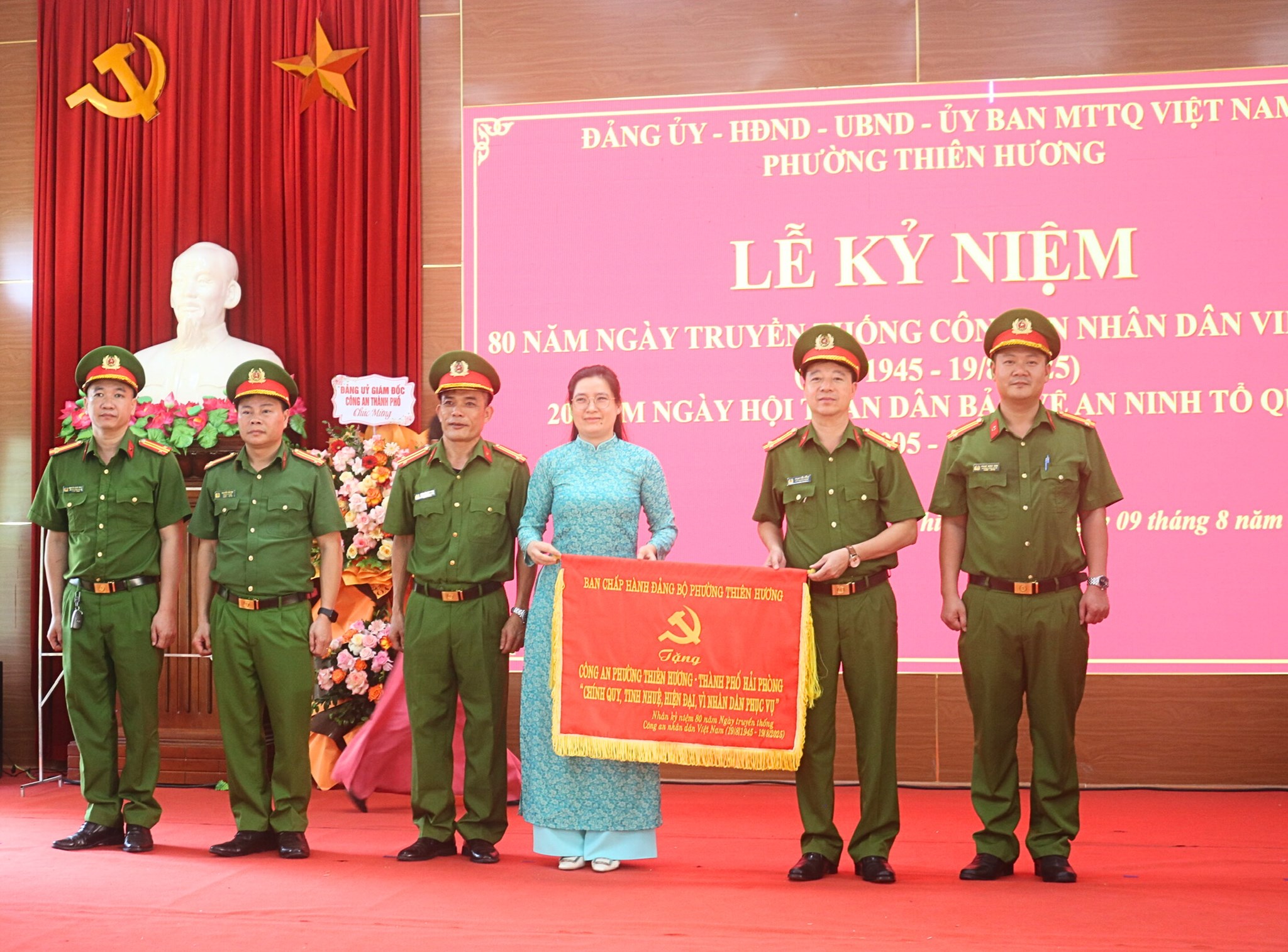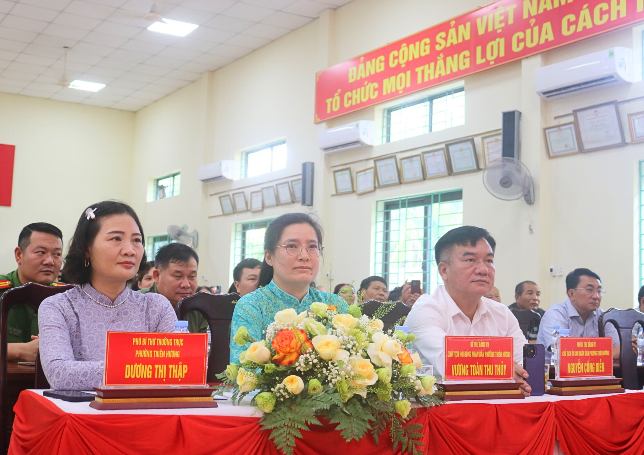 Đồng chí Vương Toàn Thu Thuỷ, Bí thư Đảng uỷ, Chủ tịch HĐND phường Thiên Hương trao tặng Công an phường Thiên Hương bức trướng mang dòng chữ: "Chính quy, tinh nhuệ, hiện đại, vì Nhân dân phục vụ”.