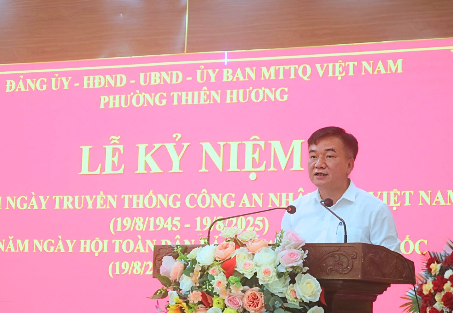 Phát biểu khai mạc Lễ kỷ niệm, đồng chí Nguyễn Công Diễn, Chủ tịch UBND phường Thiên Hương cho biết: Thời gian qua, cấp ủy, chính quyền địa phương đã chỉ đạo lực lượng Công an phối hợp chặt chẽ với Mặt trận Tổ quốc, các ban, ngành, đoàn thể làm tốt công tác nắm tình hình, tuyên truyền các Chỉ thị, Nghị quyết và chương trình quốc gia về phòng, chống tội phạm.