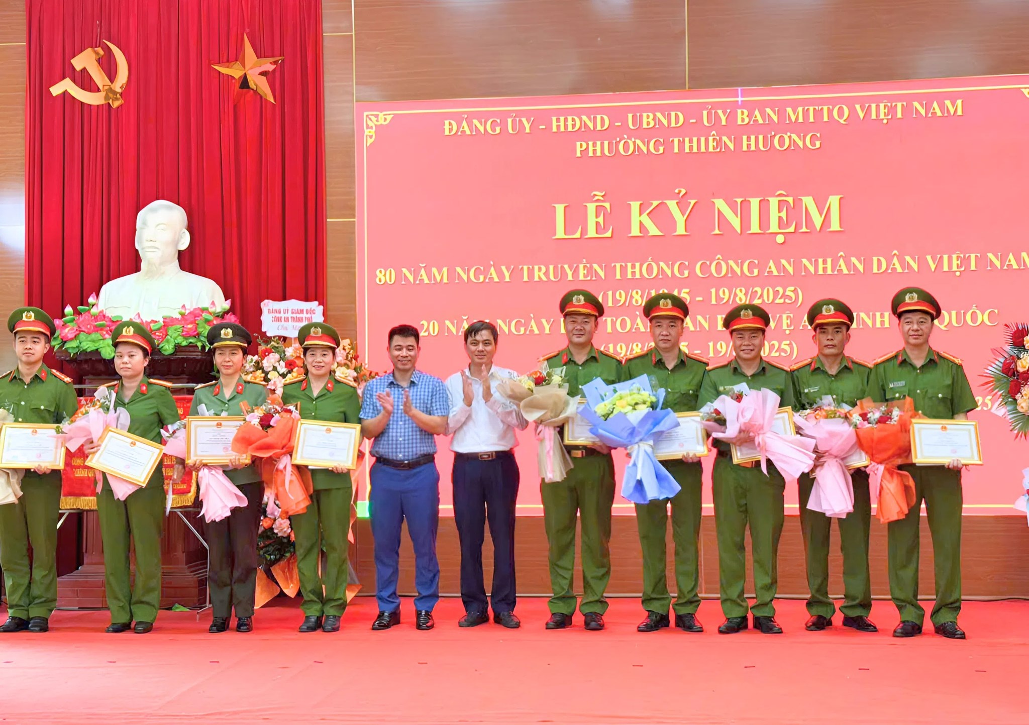 Dịp này, Chủ tịch UBND phường Thiên Hương quyết định trao giấy khen tặng 10 tập thể và 20 cá nhân có thành tích xuất sắc trong phong trào Toàn dân bảo vệ ANTQ năm 2025. Bên cạnh đó, nhân kỷ niệm 80 năm ngày truyền thống Công an nhân dân, Ban Chấp hành Đảng bộ phường Thiên Hương trao tặng Công an phường Thiên Hương bức trướng mang dòng chữ: Công an phường Thiên Hương - Thành phố Hải Phòng “Chính quy, tinh nhuệ, hiện đại, vì Nhân dân phục vụ”.