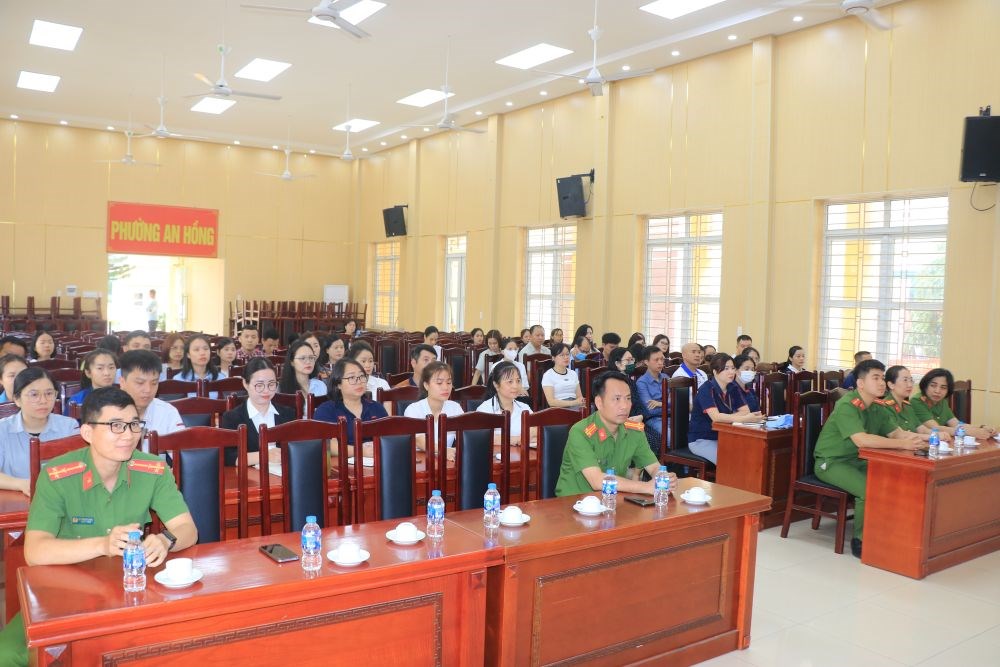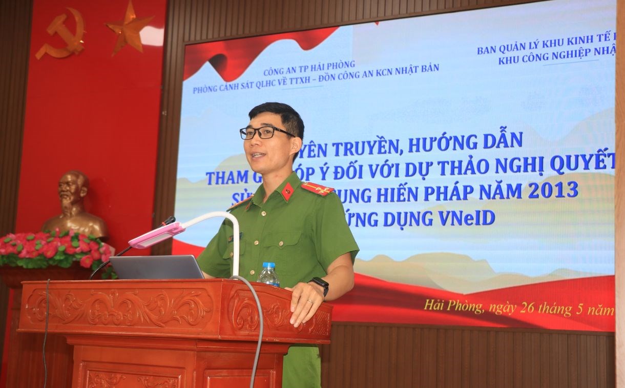 Sáng 26/5/2025, tại UBND phường An Hồng, quận Hồng Bàng, thực hiện chỉ đạo của UBND thành phố, Giám đốc CATP về việc tổ chức lấy ý kiến Nhân dân đối với dự thảo Nghị quyết sửa đổi, bổ sung một số điều của Hiến pháp năm 2013 trên ứng dụng VNeID, Đồn Công an Khu công nghiệp (KCN) Nhật Bản phối hợp với Phòng Cảnh sát QLHC về TTXH-CATP tổ chức Hội nghị tuyên truyền về tham gia ý kiến đối với dự thảo Nghị quyết sửa đổi, bổ sung một số điều của Hiến pháp năm 2013 qua ứng dung VNeID đến cán bộ, người lao động trong các doanh nghiệp thuộc KCN Nhật Bản.
