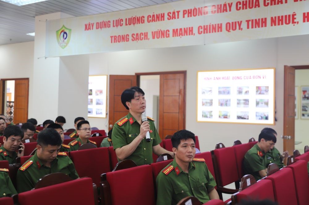 Trung tá Hoàng Văn Tiến- Trưởng phòng Phòng Cảnh sát PCCC và CNCH tiếp thu ý kiến tại hội nghị
