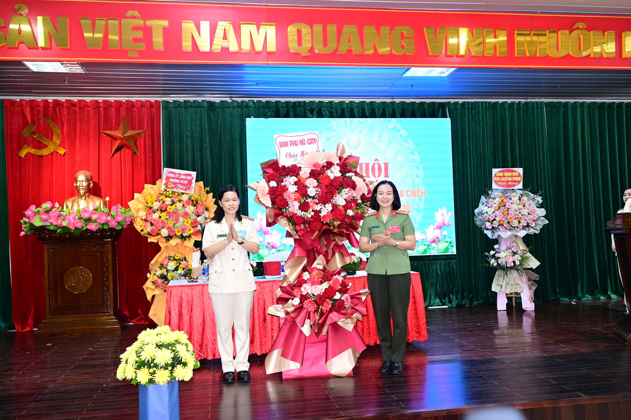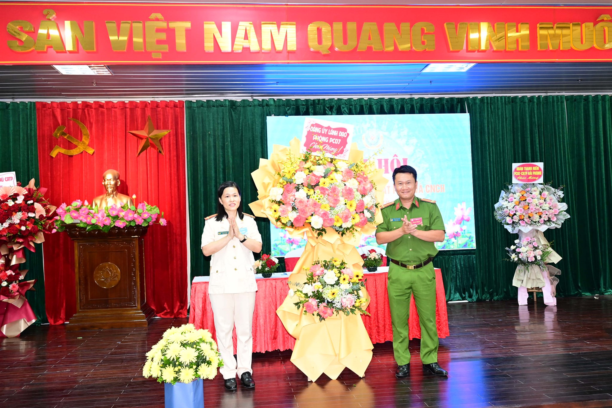 Thượng tá Nguyễn Thị Linh Chi, Trưởng Ban Phụ nữ CATP và Trung tá Hoàng Văn Tiến, Bí thư Đảng uỷ, Trưởng Phòng Cảnh sát PCCC và CNCH tặng hoa chúc mừng Đại hội