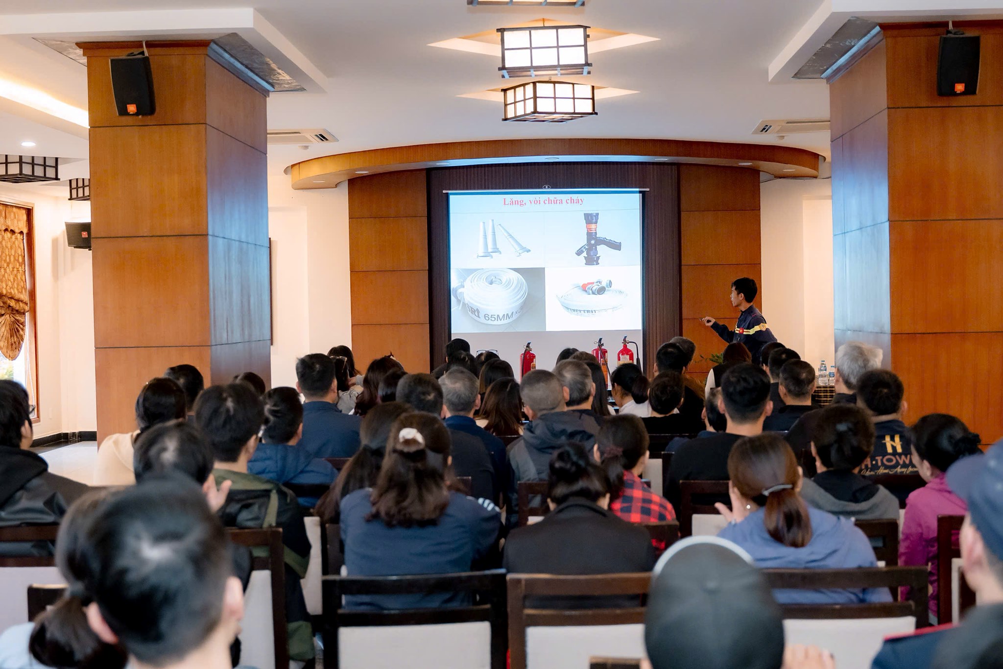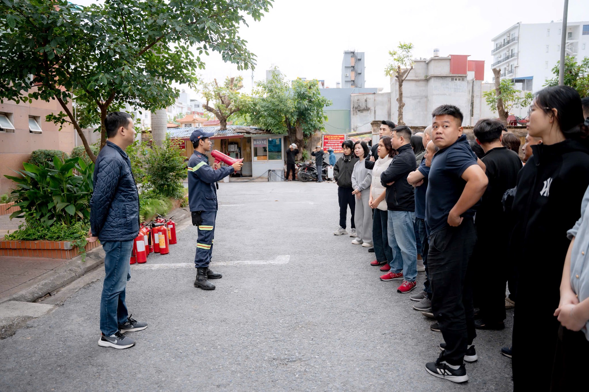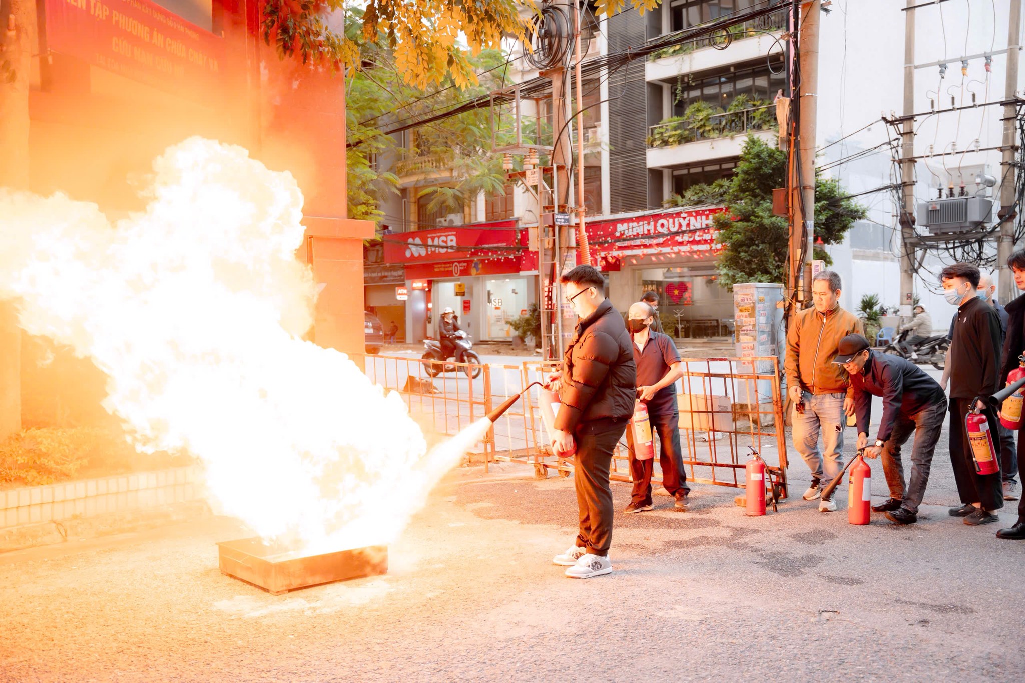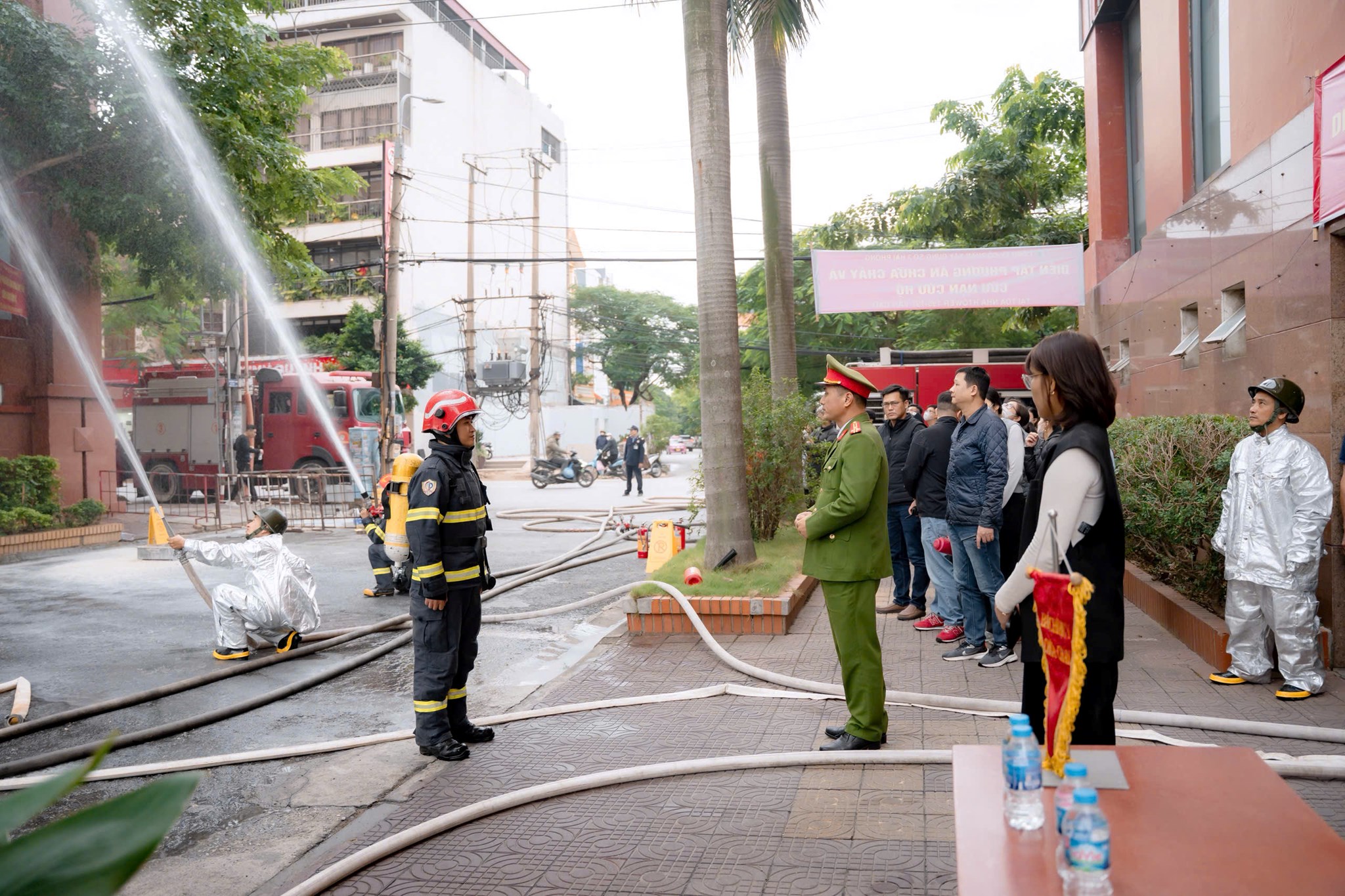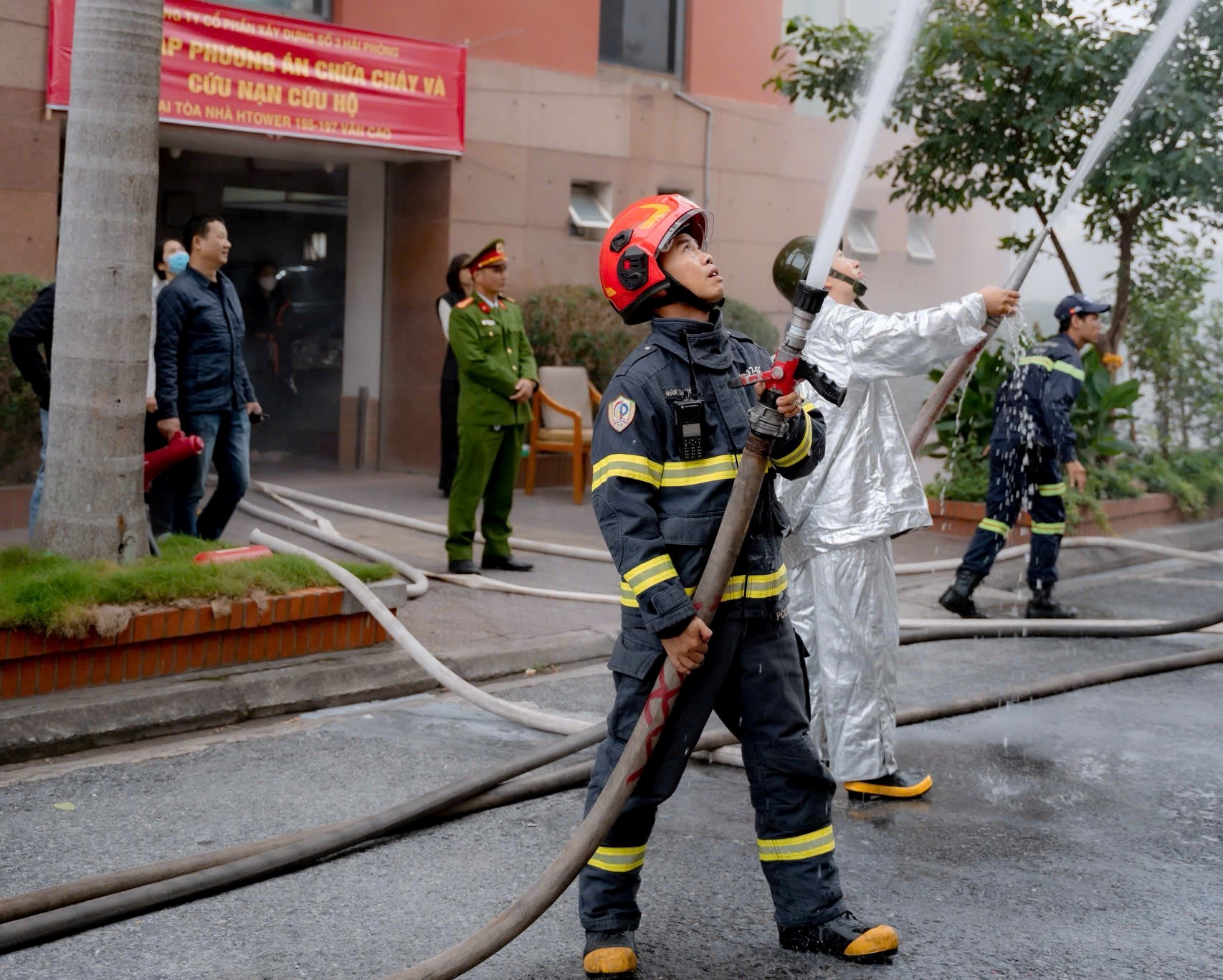 Theo đó, các lực lượng gồm 25 thành viên Đội PCCC và CNCH cơ sở và 44 nhân viên cùng diễn tập tình huống giả định xảy ra cháy khu vực nhà xe tầng 1, do sự cố thiết bị điện gây cháy. Khi xảy ra cháy, do phát hiện ra cháy muộn dẫn đến đám cháy đã cháy lan, diện tích rộng, phát triển nhanh tỏa ra nhiệt lượng lớn, nhiều khói, khí độc bao phủ toàn bộ tầng 1. Đám cháy với nhiệt tăng cao, tác động đến tính toàn vẹn của vật liệu ngăn cách, tính cách nhiệt của cấu kiện không hiệu quả, có nguy cơ cháy lan sang các khu vực xung quanh. Các tổ công tác gồm báo cháy, cơ điện, hướng dẫn thoát nạn, cứu nạn, y tế... triển khai các nhiệm vụ, toàn bộ những người còn lại, thoát nạn theo đường cửa thoát nạn dưới sự hướng dẫn của tổ hướng dẫn thoát nạn. Đội PCCC và CNCH cơ sở đã sử dụng kịp thời hệ thống báo cháy tự động, toàn bộ bình chữa cháy để chữa cháy, hướng dẫn nhân viên di chuyển tài sản, hàng hóa, tài sản và khai thác họng nước chữa cháy vách tường, máy bơm chữa cháy, vòi chữa cháy để triển khai đội hình chữa cháy...