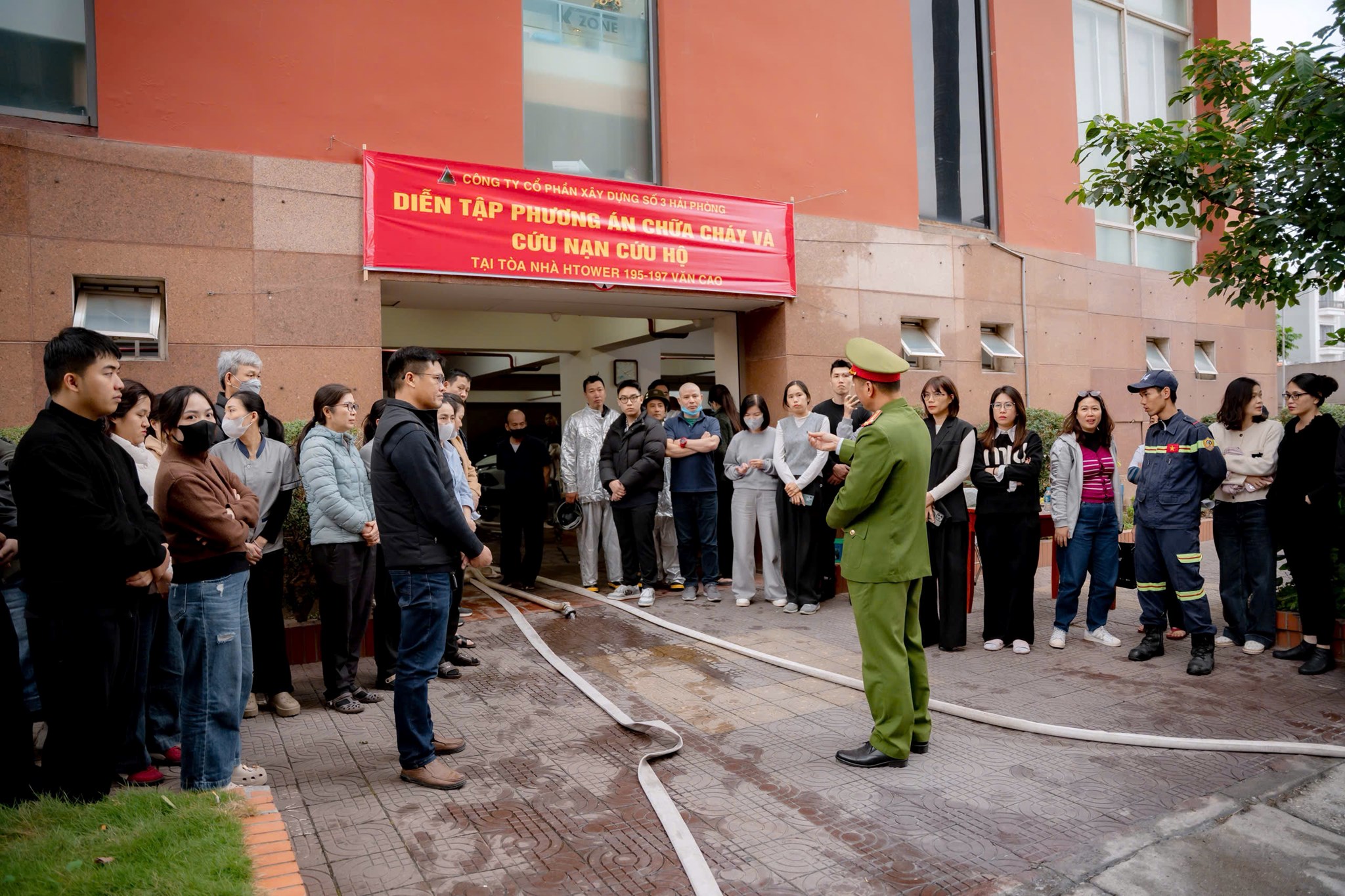 Buổi thực tập phương án chữa cháy, cứu nạn, cứu hộ năm 2025 tại Tòa nhà Htower 1 và Htower 2 (Công ty Cổ phần xây dựng số 3 Hải Phòng) diễn ra thành công, đảm bảo an toàn cho người và phương tiện.