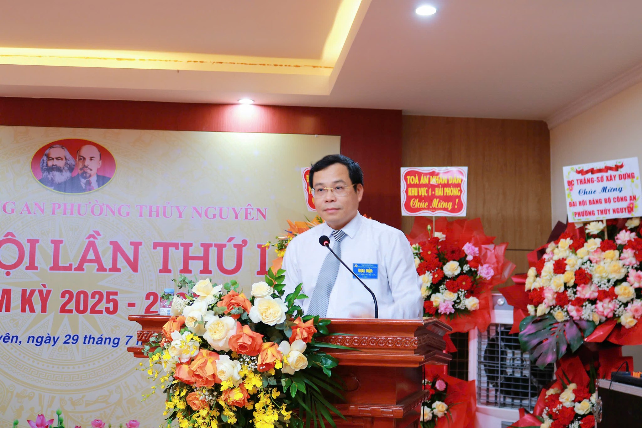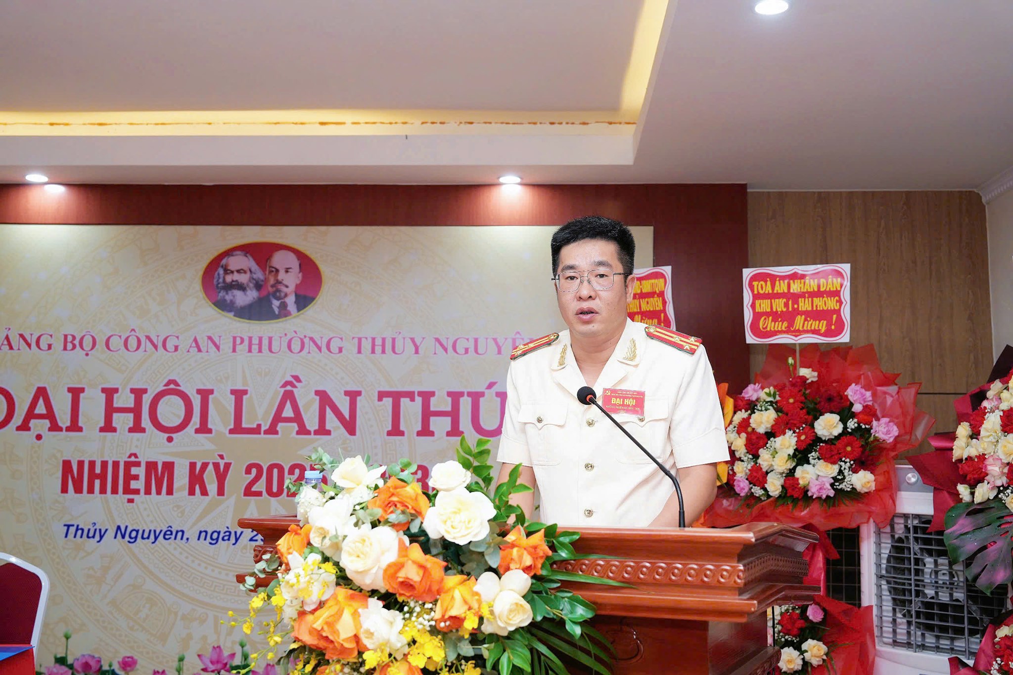 Phát biểu chỉ đạo tại Đại hội, đồng chí Phạm Hưng Hùng, Ủy viên Thành ủy, Bí thư Đảng ủy, Chủ tịch HĐND phường Thủy Nguyên ghi nhận, biểu dương những kết quả nổi bật của Chi bộ Công an trong thời gian qua, đặc biệt là vai trò xung kích, nòng cốt trong công tác bảo đảm an ninh chính trị, trật tự an toàn xã hội; chủ động nắm chắc tình hình, đấu tranh hiệu quả với các loại tội phạm và vi phạm pháp luật, giữ vững ổn định tại địa bàn, góp phần quan trọng vào sự phát triển chung của địa phương. Đồng chí cũng yêu cầu Đảng bộ Công an phường tiếp tục phát huy tinh thần đoàn kết, đổi mới phương thức lãnh đạo, chủ động nắm chắc tình hình, nâng cao chất lượng công tác nghiệp vụ, giữ vững ổn định địa bàn, xứng đáng là lực lượng tin cậy của cấp ủy, chính quyền và nhân dân trong thời kỳ mới.