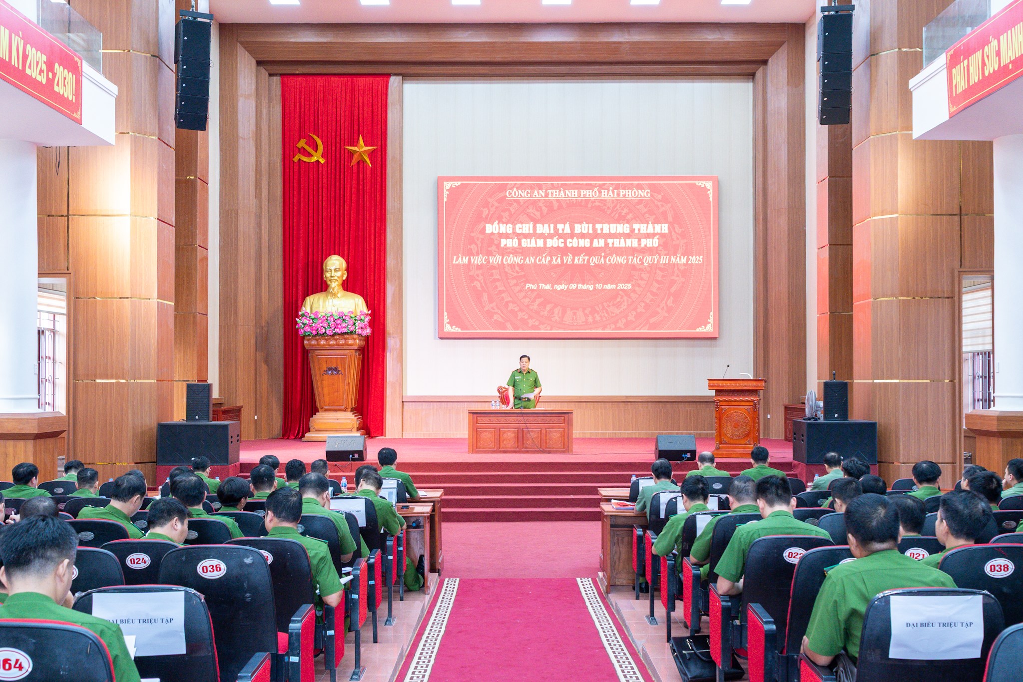 Chiều 9/10/2025, tại trụ sở UBND xã Phú Thái, Đại tá Bùi Trung Thành, Ủy viên BTV Đảng ủy, Phó giám đốc CATP, Thủ trưởng Cơ quan Cảnh sát điều tra Công an thành phố dẫn đầu đoàn công tác của CATP làm việc với chỉ huy Công an 22 phường, xã về công tác bảo đảm ANTT 3 tháng sau khi thực hiện mô hình tổ chức mới và các giải pháp hoàn thành chỉ tiêu, nhiệm vụ công tác những tháng cuối năm 2025. Cùng dự làm việc có đại diện lãnh đạo các Phòng nghiệp vụ CATP: Văn phòng Cơ quan CSĐT, Phòng Cảnh sát hình sự, Phòng Cảnh sát kinh tế, Phòng CSĐT tội phạm ma túy, Phòng Cảnh sát QLHC về TTXH cùng chỉ huy Công an cụm 22 phường, xã trên địa bàn phía tây thành phố Hải Phòng.