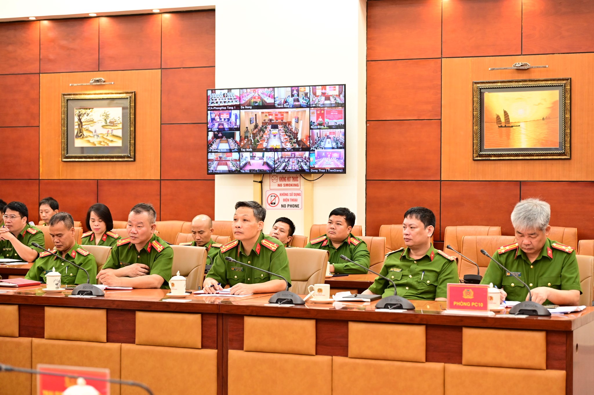 Đại tá Phạm Chí Hiếu - Phó Giám đốc Công an thành phố, đại diện Công an các đơn vị, địa phương dự tại điểm cầu Công an thành phố Hải Phòng