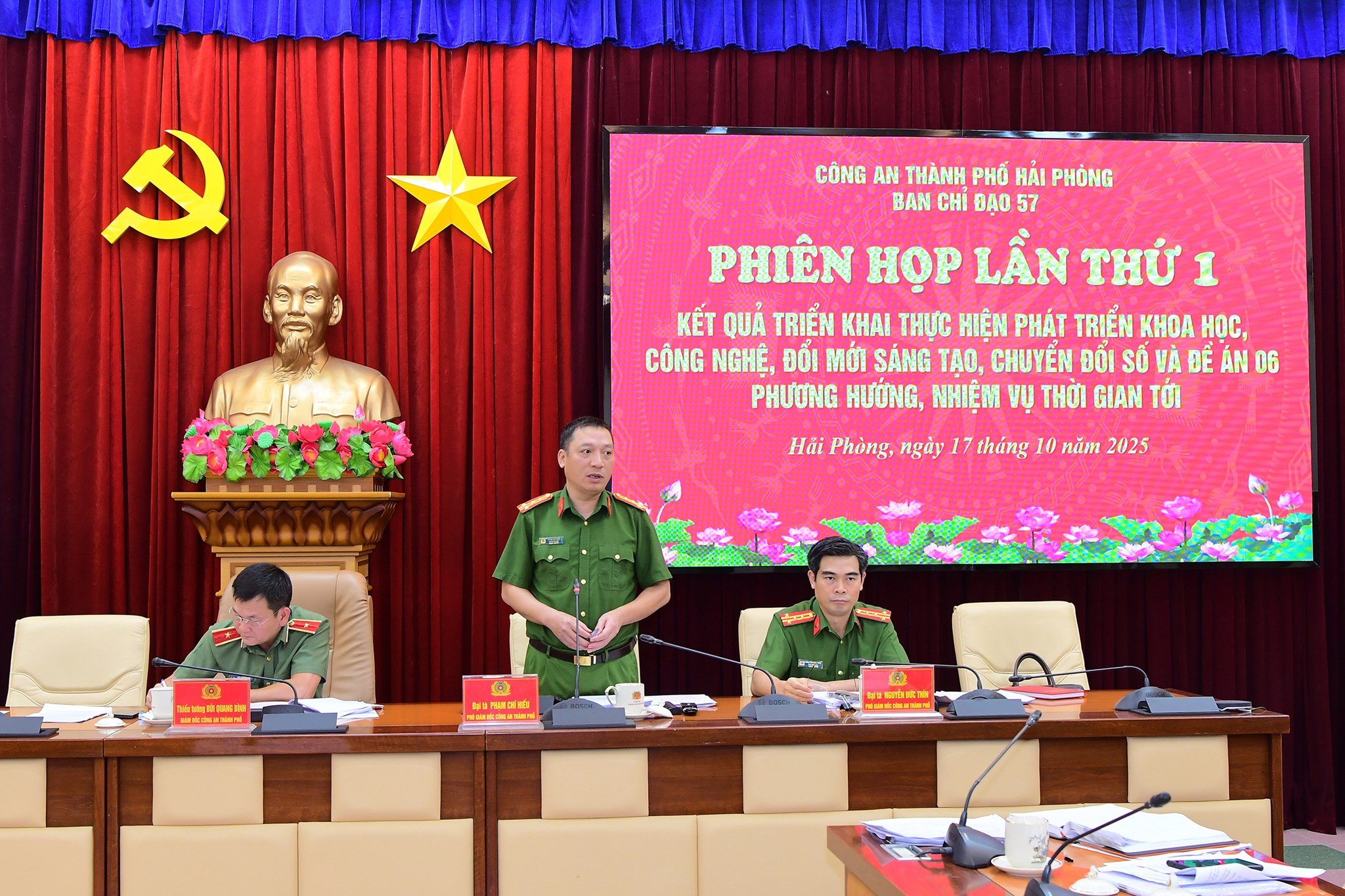 Sáng 17/10/2025, Ban chỉ đạo phát triển khoa học, công nghệ, đổi mới sáng tạo, chuyển đổi số và Đề án 06 Công an thành phố (gọi tắt là BCĐ 57) tổ chức phiên họp thứ nhất nhằm đánh giá kết quả công tác phát triển khoa học, công nghệ, đổi mới sáng tạo, chuyển đổi số và Đề án 06 trong CATP và thống nhất một số nội dung công tác để tham mưu cho BCĐ 57 CATP triển khai trong thời gian tới. Thiếu tướng Bùi Quang Bình, Ủy viên BTV Thành ủy, Bí thư Đảng ủy, Giám đốc CATP, Trưởng BCĐ 57 CATP chủ trì, chỉ đạo phiên họp. Cùng dự có Đại tá Phạm Chí Hiếu, Phó giám đốc CATP, Phó trưởng ban thường trực BCĐ 57 CATP; Đại tá Bùi Trung Thành, Phó giám đốc CATP; Đại tá Nguyễn Đức Thìn, Phó giám đốc CATP; các thành viên BCĐ 57 CATP, Tổ thư ký giúp việc BCĐ 57 CATP; lãnh đạo các Phòng nghiệp vụ CATP…
