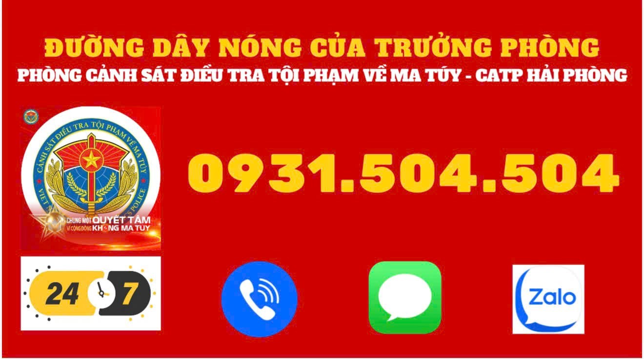 Để kịp thời tiếp nhận và xử lý mọi thông tin liên quan đến hoạt động mua bán, vận chuyển, tàng trữ hoặc tổ chức sử dụng trái phép chất ma túy, người dân có thể liên hệ trực tiếp qua số Hotline: 0931.504.504 của Thượng tá Phạm Hữu Đoàn – Trưởng Phòng Cảnh sát điều tra tội phạm về ma túy, Công an thành phố Hải Phòng.