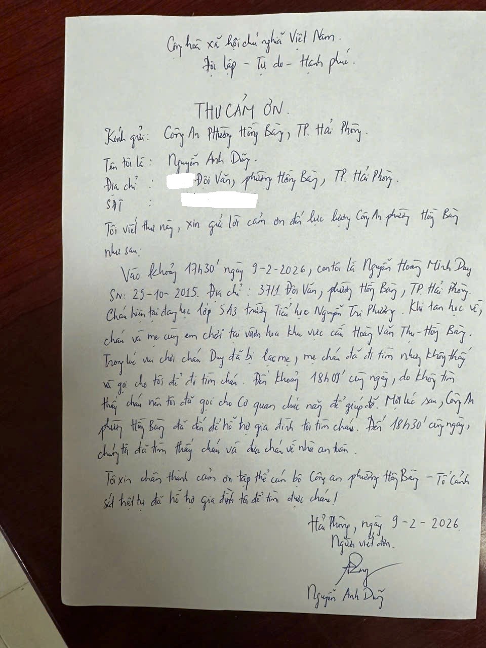 Vào khoảng 17h30’ ngày 09/02/2026, chị V.T.A.Ng (sinh năm 1990, trú tại Đội Văn, phường Hồng Bàng, Hải Phòng) đưa con trai là Ng. H.M.D sinh năm 2015 đến vui chơi tại vườn hoa khu vực cầu Hoàng Văn Thụ, phường Hồng Bàng.