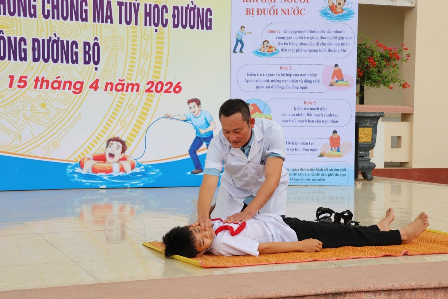 Tại buổi tuyên truyền, Đội Cảnh sát đường thủy số 3 đã phổ biến các nguyên nhân, nguy cơ và biện pháp phòng tránh tai nạn đuối nước. Đồng thời, cán bộ Trạm Y tế xã Hà Đông đã hướng dẫn kỹ năng sơ cứu người bị đuối nước, giúp giáo viên và học sinh nắm vững các thao tác xử lý thực tế.