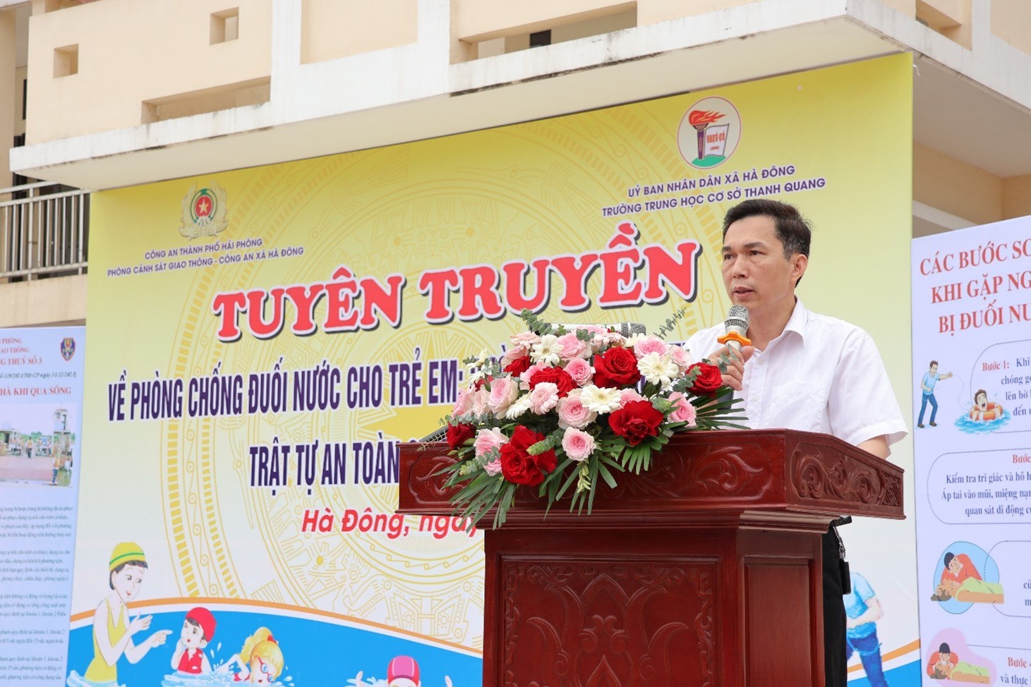 Sáng ngày 15/04/2024, tại Trường THCS Thanh Quang, Công an xã Hà Đông phối hợp với Đội Cảnh sát đường thủy số 3 (Phòng Cảnh sát giao thông - Công an TP Hải Phòng) tổ chức buổi tuyên truyền về phòng chống đuối nước, ma túy học đường và bảo đảm trật tự an toàn giao thông. Tham dự chương trình có đồng chí Hoàng Văn Đại, Chủ tịch UBND xã Hà Đông; đại diện chỉ huy các đơn vị phối hợp, cùng 44 cán bộ, giáo viên và hơn 700 học sinh nhà trường.