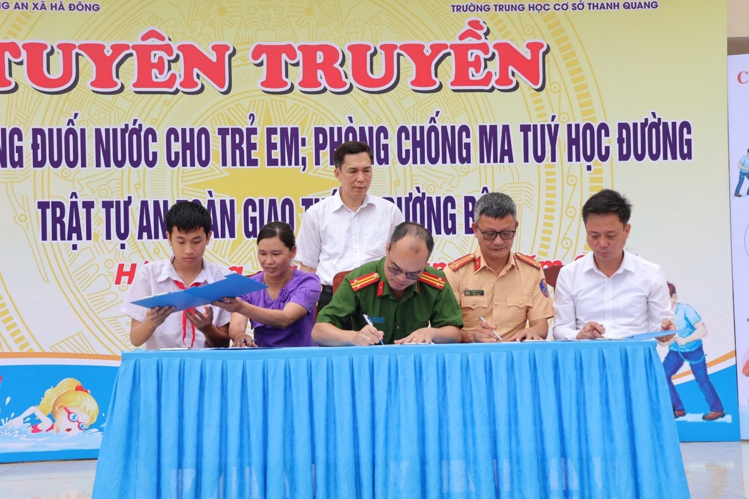 Kết thúc chương trình, đại diện Phòng Cảnh sát giao thông, Công an xã Hà Đông, Ban Giám hiệu nhà trường cùng đại diện phụ huynh và học sinh đã tiến hành ký cam kết thực hiện nghiêm các nội dung tuyên truyền dưới sự chứng kiến của chính quyền địa phương.