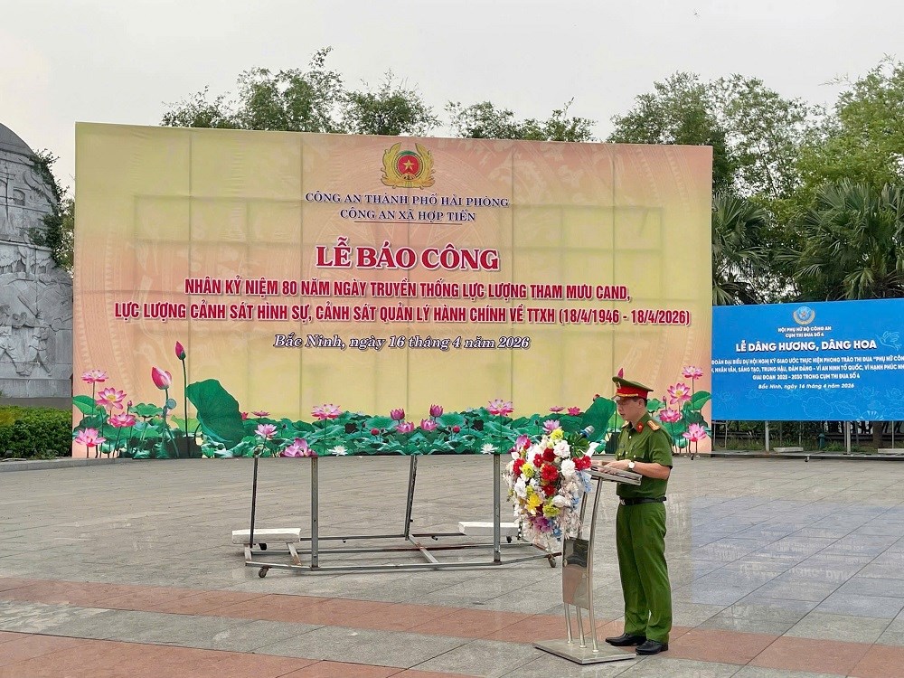 Trong không khí thi đua sôi nổi hướng tới kỷ niệm 80 năm Ngày truyền thống lực lượng Tham mưu CAND, lực lượng Cảnh sát Hình sự và lực lượng Cảnh sát Quản lý hành chính về trật tự xã hội (18/4/1946 - 18/4/2026), ngày 16/4, Công an xã Hợp Tiến, TP Hải Phòng đã tổ chức đoàn về báo công dâng Bác tại Khu lưu niệm Sáu điều Bác Hồ dạy CAND (tỉnh Bắc Ninh). Đoàn do đồng chí Thượng tá Vũ Đức Trung, Bí thư Đảng ủy, Trưởng Công an xã Hợp Tiến làm Trưởng đoàn.