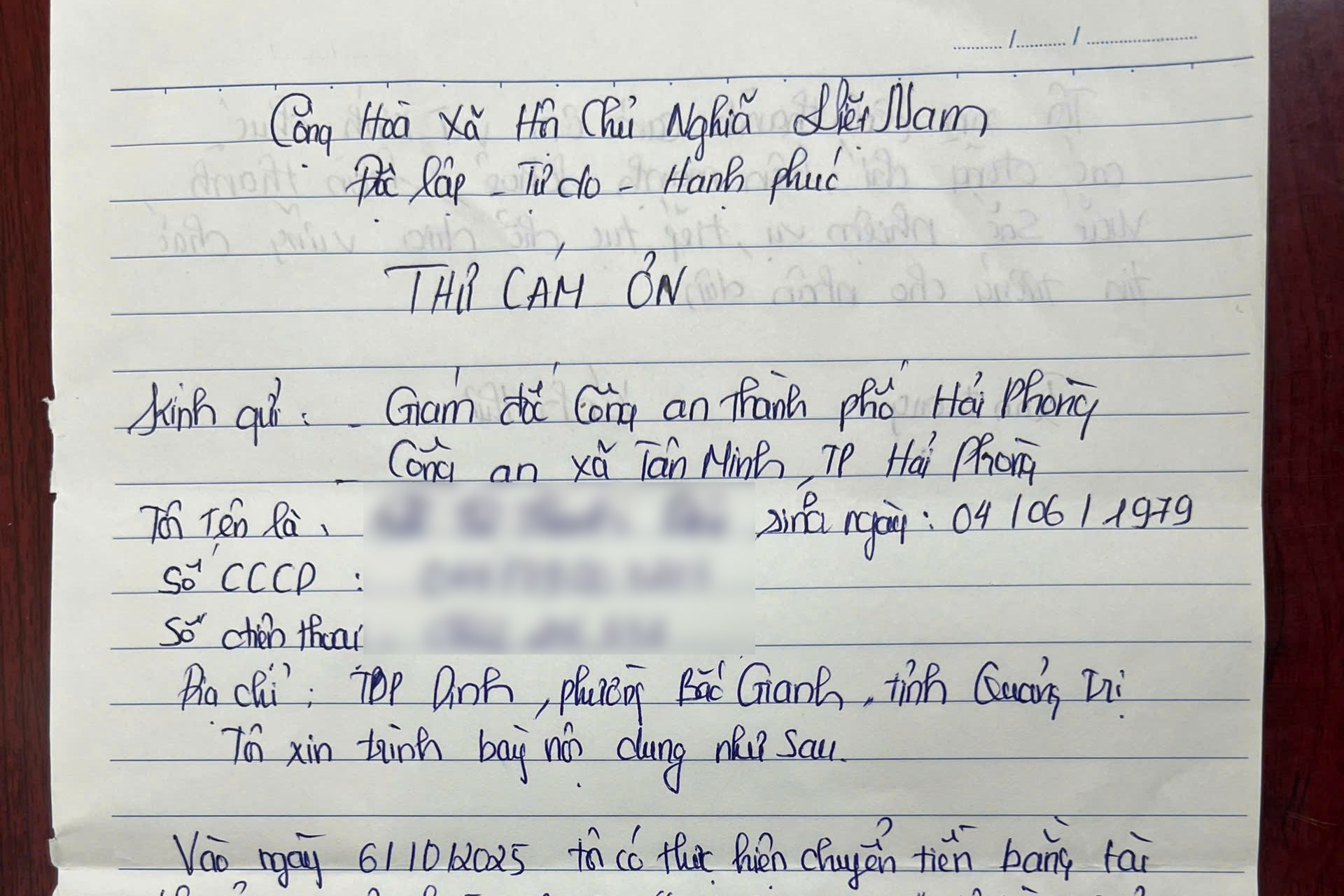 Sau khi nhận lại được tài sản, ngày 16/4/2026, bà L.T.T.D đã gửi thư cảm ơn đến Giám đốc Công an thành phố Hải Phòng và Công an xã Tân Minh. Việc làm thiết thực này thể hiện rõ tinh thần "Vì Nhân dân phục vụ", góp phần xây dựng hình ảnh đẹp của người chiến sĩ Công an thành phố Hải Phòng.