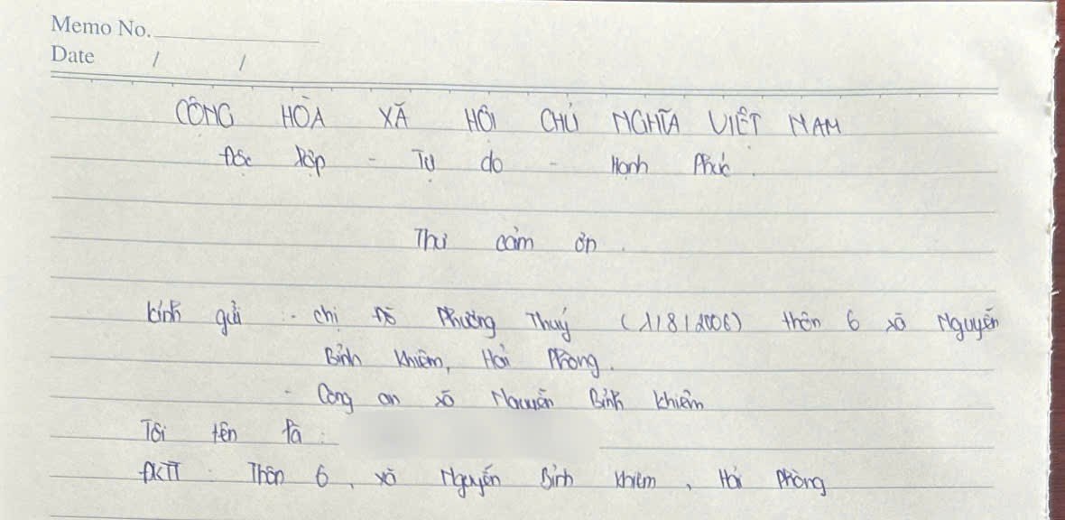 Chị P.T.T đã nhận lại tài sản và gửi lời cảm ơn sâu sắc đến chị Đỗ Phương Thúy cùng tập thể cán bộ, chiến sĩ Công an xã Nguyễn Bỉnh Khiêm. Sự việc có ý nghĩa lan tỏa gương người tốt việc tốt và củng cố niềm tin của Nhân dân đối với lực lượng Công an cơ sở.