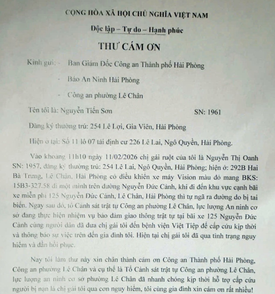 Xúc động trước hành động kịp thời và nghĩa tình của lực lượng làm nhiệm vụ, ông Nguyễn Tiến Sơn (em trai nạn nhân) đã gửi thư bày tỏ sự cảm ơn chân thành tới Công an thành phố Hải Phòng, Công an phường Lê Chân, đặc biệt là Tổ Cảnh sát trật tự và lực lượng an ninh cơ sở phường Lê Chân đã nhanh chóng hỗ trợ gia đình trong lúc nguy cấp.
