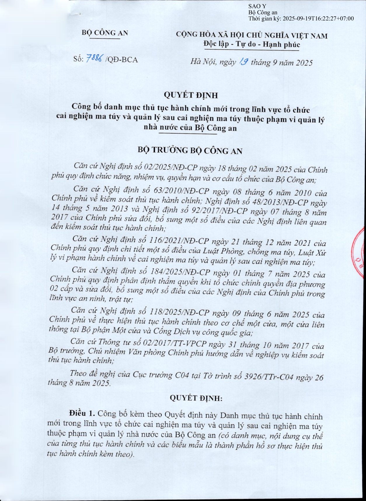 Quyết định công bố danh mục thủ tục hành chính mới trong lĩnh vực tổ chức cai nghiện ma túy và quản lý sau cai nghiện ma túy thuộc phạm vi quản lý nhà nước của Bộ Công an.