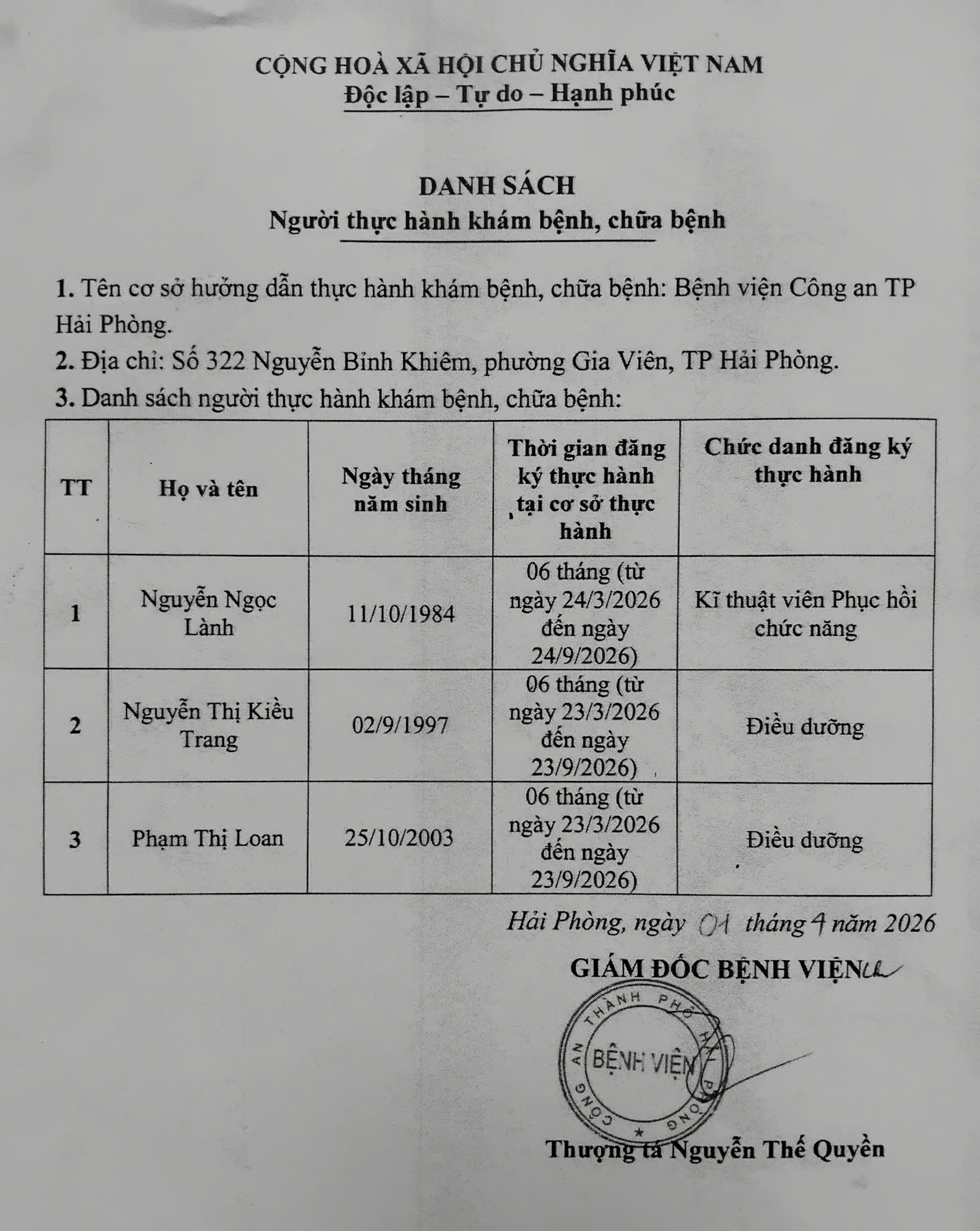 Bệnh viện Công an TP Hải Phòng thông báo danh sách đăng ký thực hành chuyên môn khám bệnh, chữa bệnh của 03 người đăng kí thực hành tại Bệnh viện Công an thành phố Hải Phòng.