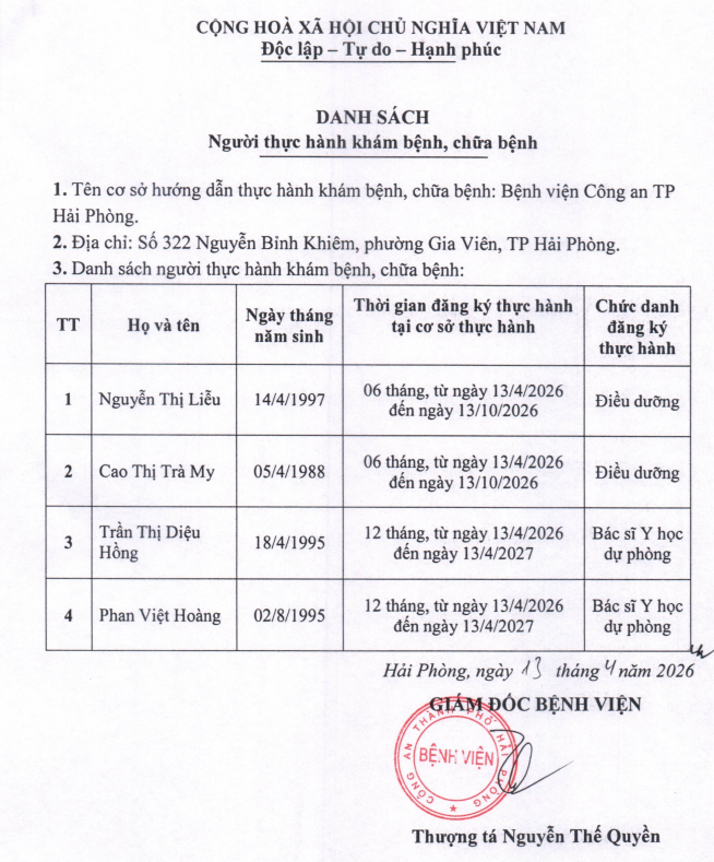 Bệnh viện Công an TP Hải Phòng thông báo danh sách đăng ký thực hành chuyên môn khám bệnh, chữa bệnh của 04 người đăng kí thực hành tại Bệnh viện Công an thành phố Hải Phòng như sau: