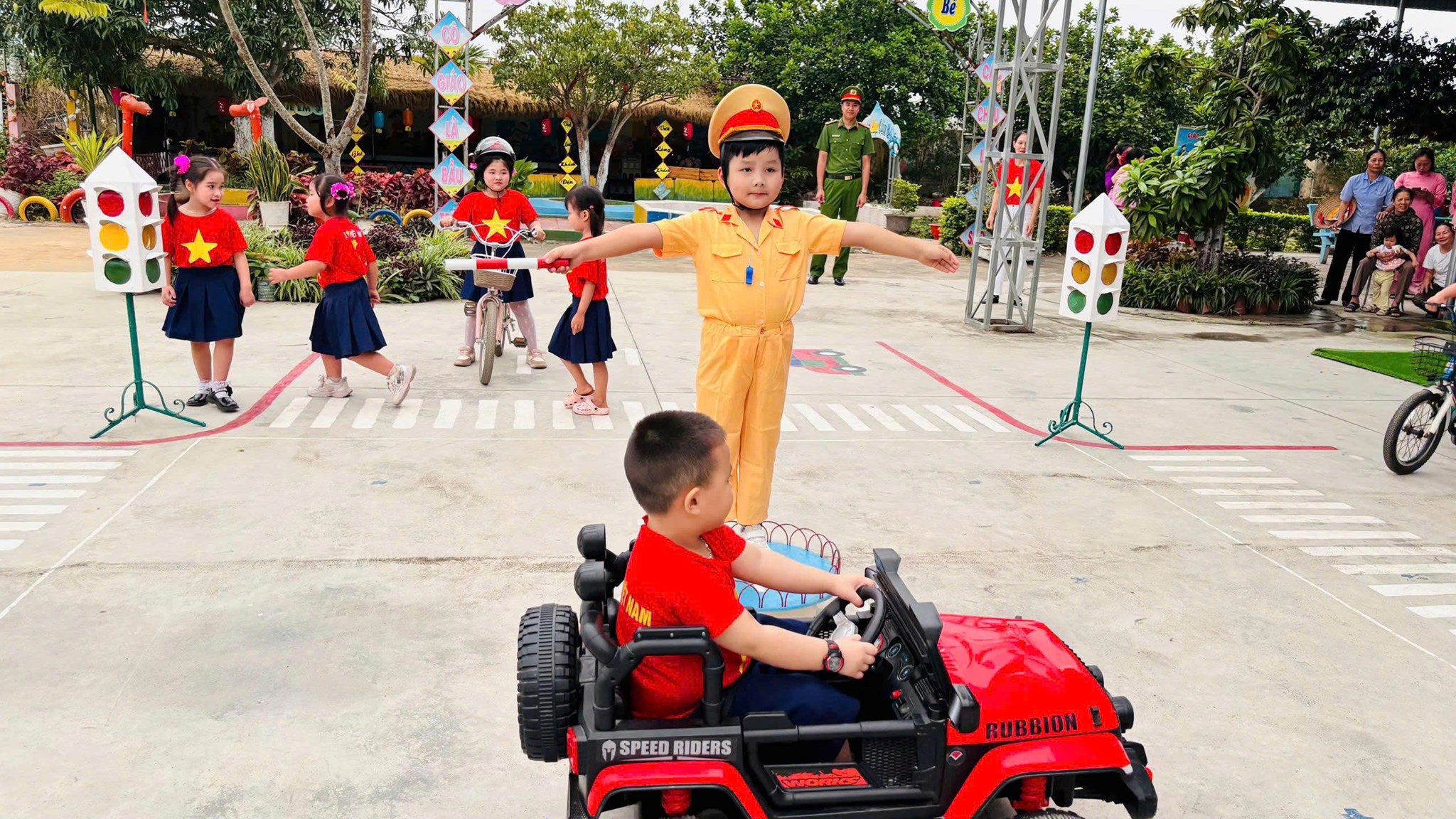 Chương trình diễn ra với nhiều nội dung sôi nổi, thiết thực bao gồm: Các tiết mục văn nghệ và màn đồng diễn thể dục nhịp điệu “Giao thông an toàn”; hội thi “Rung chuông vàng” với chủ đề “Bé vui học luật lệ an toàn giao thông”; hoạt động trải nghiệm “Bé lái xe an toàn - Chọn tranh đúng, sai”. Đặc biệt, tại phần thực hành “Em đi qua ngã tư đường phố”, các cán bộ Chi đoàn Công an xã đã trực tiếp hướng dẫn, giúp các bé rèn luyện kỹ năng qua đường, nhận biết tín hiệu đèn giao thông và tuân thủ chỉ dẫn của lực lượng chức năng.