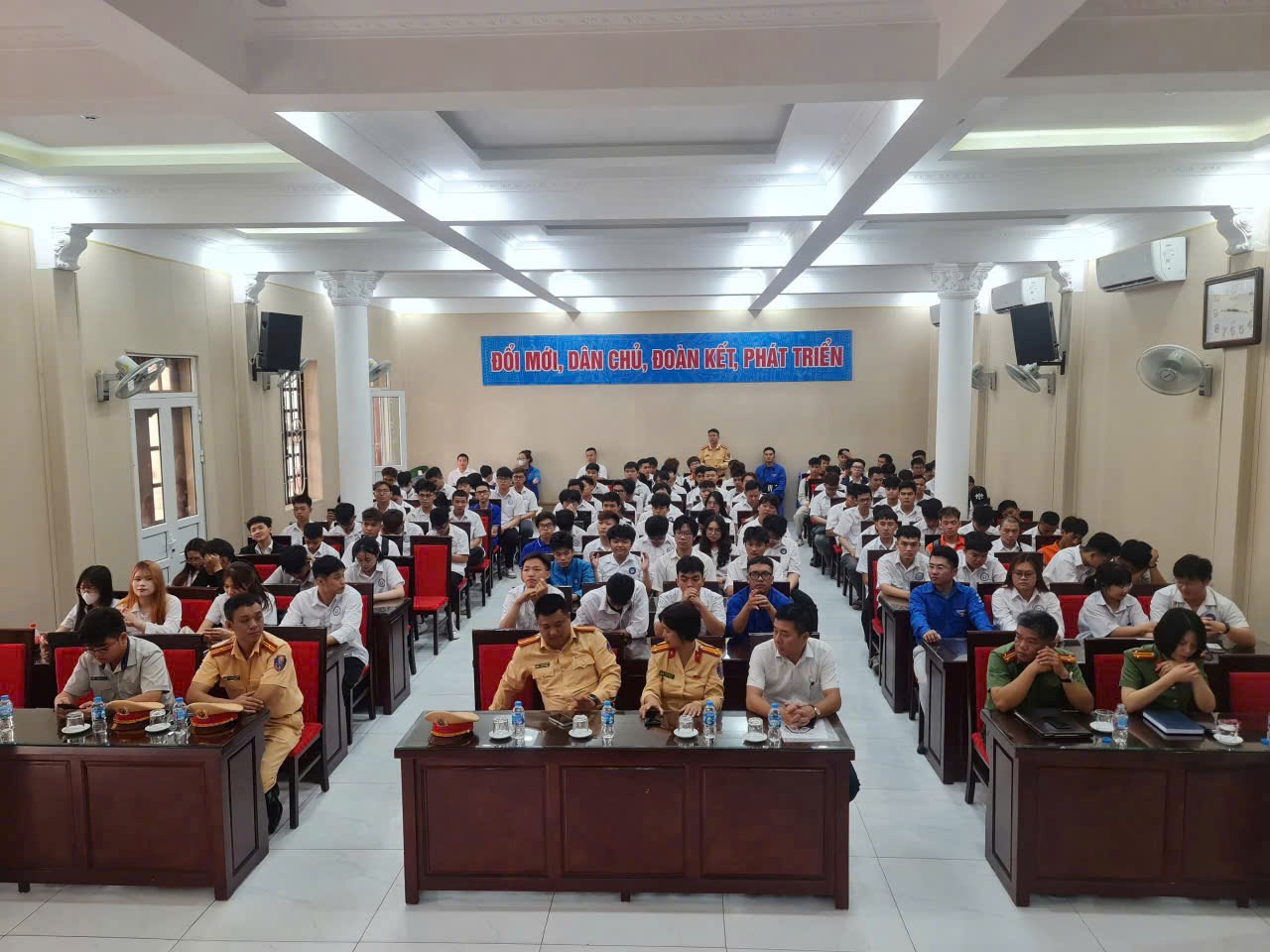 Sáng ngày 9/4/2026, Phòng Cảnh sát giao thông phối hợp cùng Phòng An ninh kinh tế (Công an TP. Hải Phòng) tổ chức chương trình tuyên truyền, phổ biến giáo dục pháp luật về trật tự an toàn giao thông cho hơn 200 học sinh, sinh viên Trường Cao đẳng Hàng hải và Đường thủy I.
