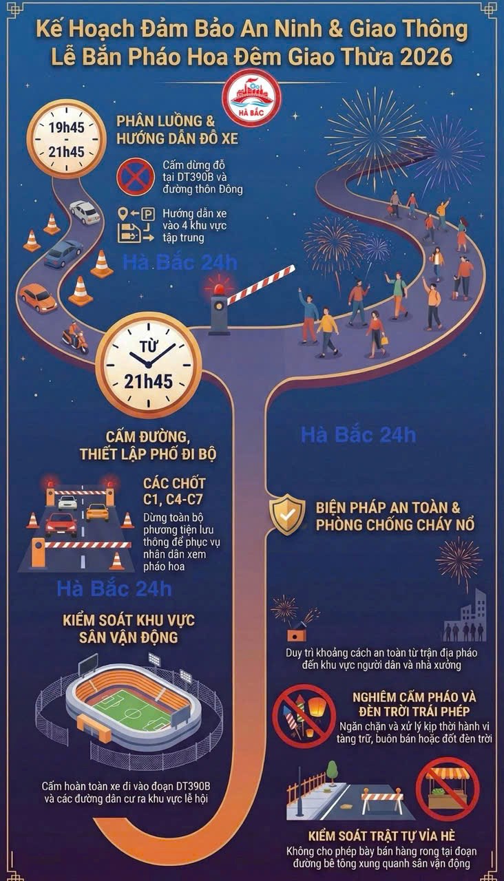 Để bảo đảm an ninh trật tự - an toàn giao thông phục đêm nhạc và chương trình bắn pháo hoa Chào Xuân Bính Ngọ tại sân vận động Hồng Lạc, xã Hà Bắc, thành phố Hải Phòng, Công an thành phố đã chỉ đạo Công an xã Hà Bắc phối hợp với các đơn vị triển khai phương án tăng cường lực lượng bảo đảm an ninh trật tự - an toàn giao thông trong đêm 16/02 (tức 29 Tết) đến sáng 17/02/2026 (tức ngày Mùng 1 Tết).