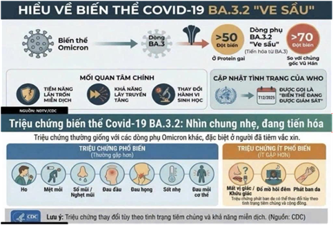 Theo thông tin từ Bộ Y tế và Tổ chức Y tế thế giới (WHO), biến thể SARS-CoV-2 BA.3.2 (còn được gọi là biến thể “ve sầu”) xuất hiện tại 23 quốc gia và hiện được xếp vào nhóm biến thể đang được theo dõi. WHO đánh giá nguy cơ của biến thể đối với sức khỏe cộng đồng ở mức thấp so với các dòng Omicron đang lưu hành hiện nay. Theo WHO, biến thể BA.3.2 có một số thay đổi về đặc tính kháng nguyên và khả năng né tránh miễn dịch trong điều kiện phòng thí nghiệm. Tuy nhiên, đến nay chưa có bằng chứng cho thấy biến thể này làm gia tăng mức độ nặng của bệnh, số ca nhập viện hoặc tử vong. WHO đồng thời nhận định các vắc-xin COVID-19 hiện hành vẫn tiếp tục có tác dụng phòng, chống bệnh tiến triển nặng, tử vong.