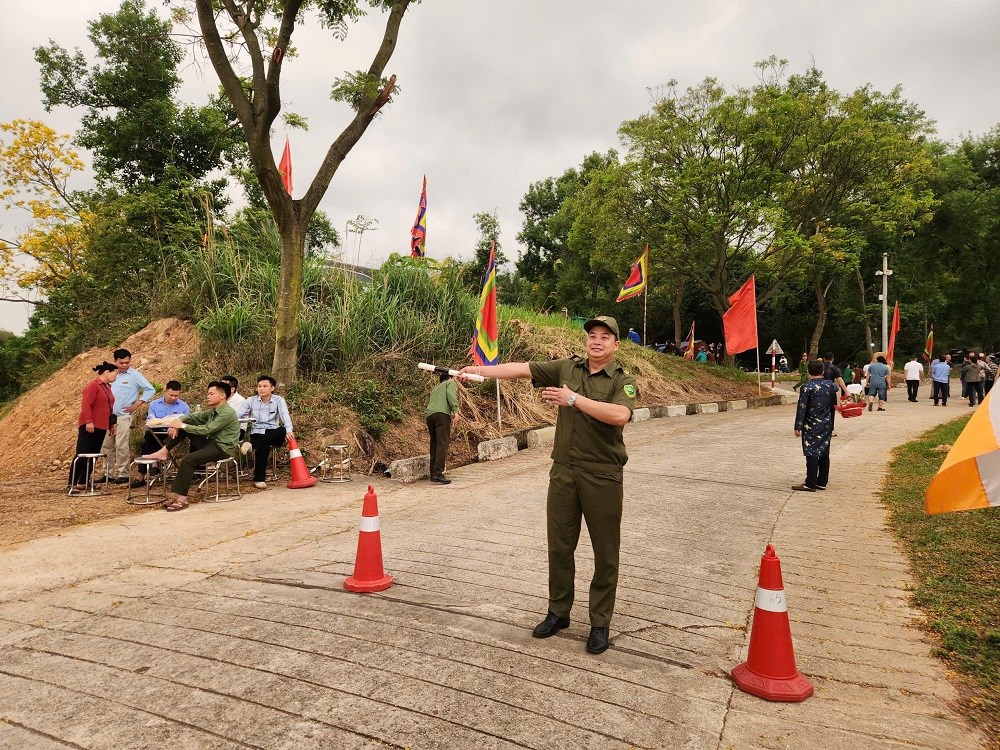Cán bộ Công an phường Nguyễn Trãi thực hiện nhiệm vụ bảo đảm an ninh trật tự tại khu vực tổ chức các trò chơi trong khuôn khổ lễ hội truyền thống Di sản thế giới Chùa Thanh Mai