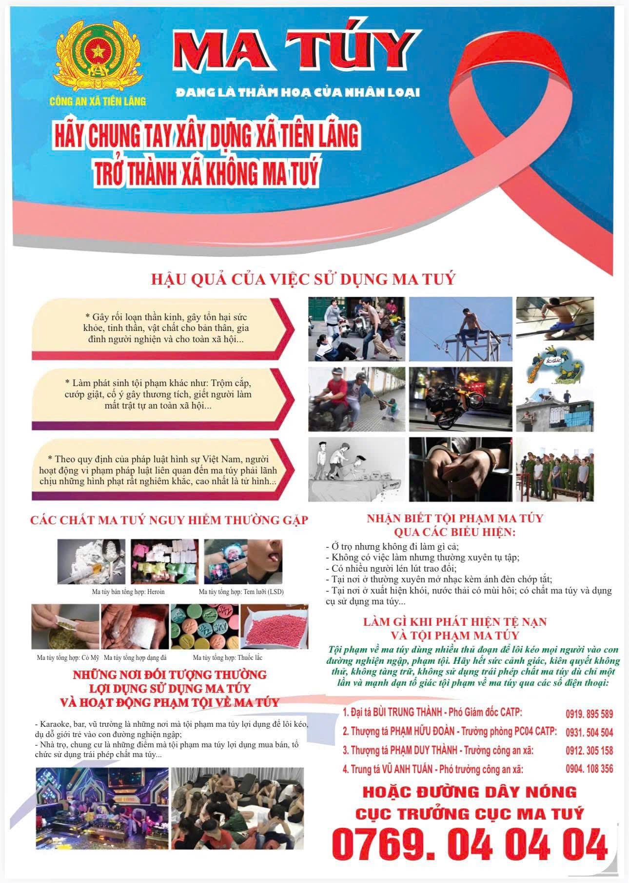 Theo đó, Công an xã đã tổ chức các hội nghị tuyên truyền trực tiếp đến đội ngũ cán bộ chủ chốt của xã, bí thư chi bộ, trưởng thôn, lực lượng tham gia bảo vệ an ninh trật tự ở cơ sở. Nội dung tuyên truyền tập trung vào công tác phòng, chống ma túy; phòng cháy, chữa cháy; hướng dẫn sử dụng ứng dụng định danh điện tử VNeID và tích hợp các loại giấy tờ cần thiết trên nền tảng số. Bên cạnh đó, đơn vị đã phát 300 tờ rơi tuyên truyền về tác hại của ma túy và các biện pháp phòng, chống; đồng thời cung cấp thông tin đường dây nóng của lực lượng chức năng, số điện thoại lãnh đạo các cấp và Công an xã để người dân kịp thời phản ánh, cung cấp thông tin liên quan, góp phần xây dựng địa bàn không có ma túy.