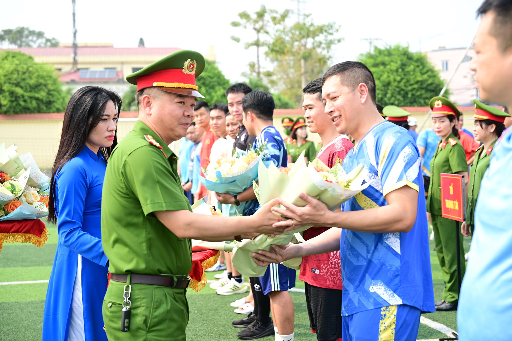 Thượng tá Lê Văn Bình - Trưởng Công an phường Hồng An (Cụm trưởng cụm thi đua số 1) và chỉ huy các đơn vị tặng hoa và cơ lưu niệm cho các đội tuyển