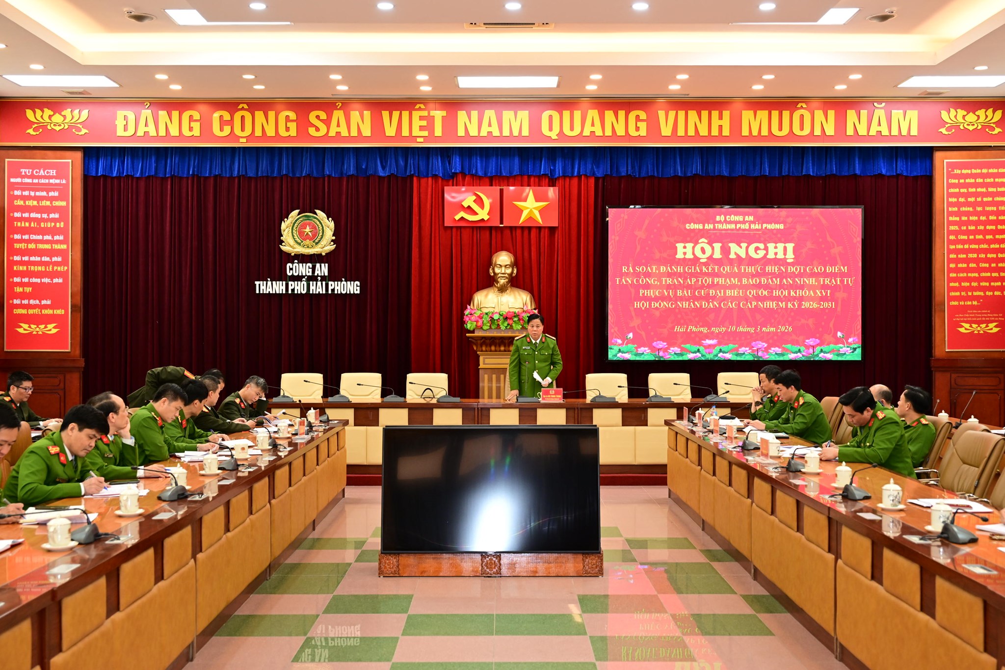 Hội nghị tiến hành đánh giá tình hình, kết quả thực hiện chỉ tiêu Đợt cao điểm tấn công, trấn áp tội phạm theo Quyết định 2117/QĐ-CAHP-PV01 ngày 26/12/2025 của Giám đốc CATP; kết quả thực hiện Đợt cao điểm tấn công, trấn áp tội phạm bảo đảm ANTT, bảo đảm tuyệt đối an ninh, an toàn bầu cử đại biểu Quốc hội khóa XVI, đại biểu HĐND các cấp, nhiệm kỳ 2026 – 2031; thông báo kết quả kiểm tra việc thực hiện đợt cao điểm tại Công an một số đơn vị, địa phương theo chỉ đạo của Giám đốc CATP.