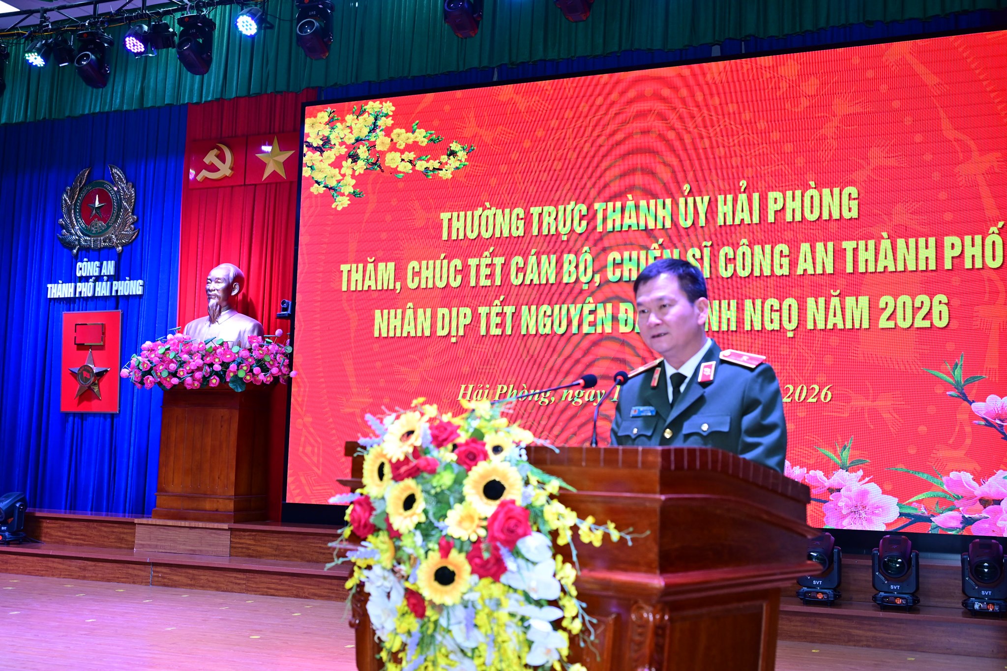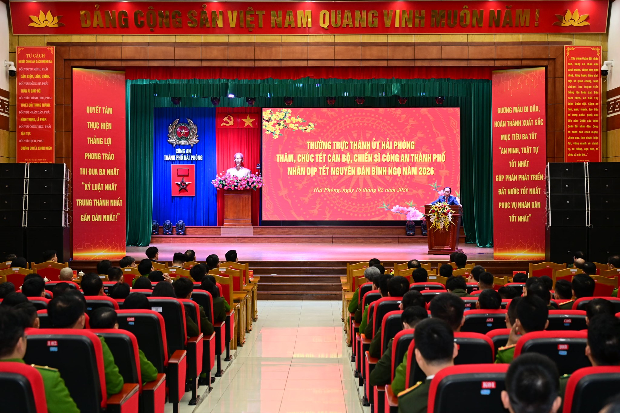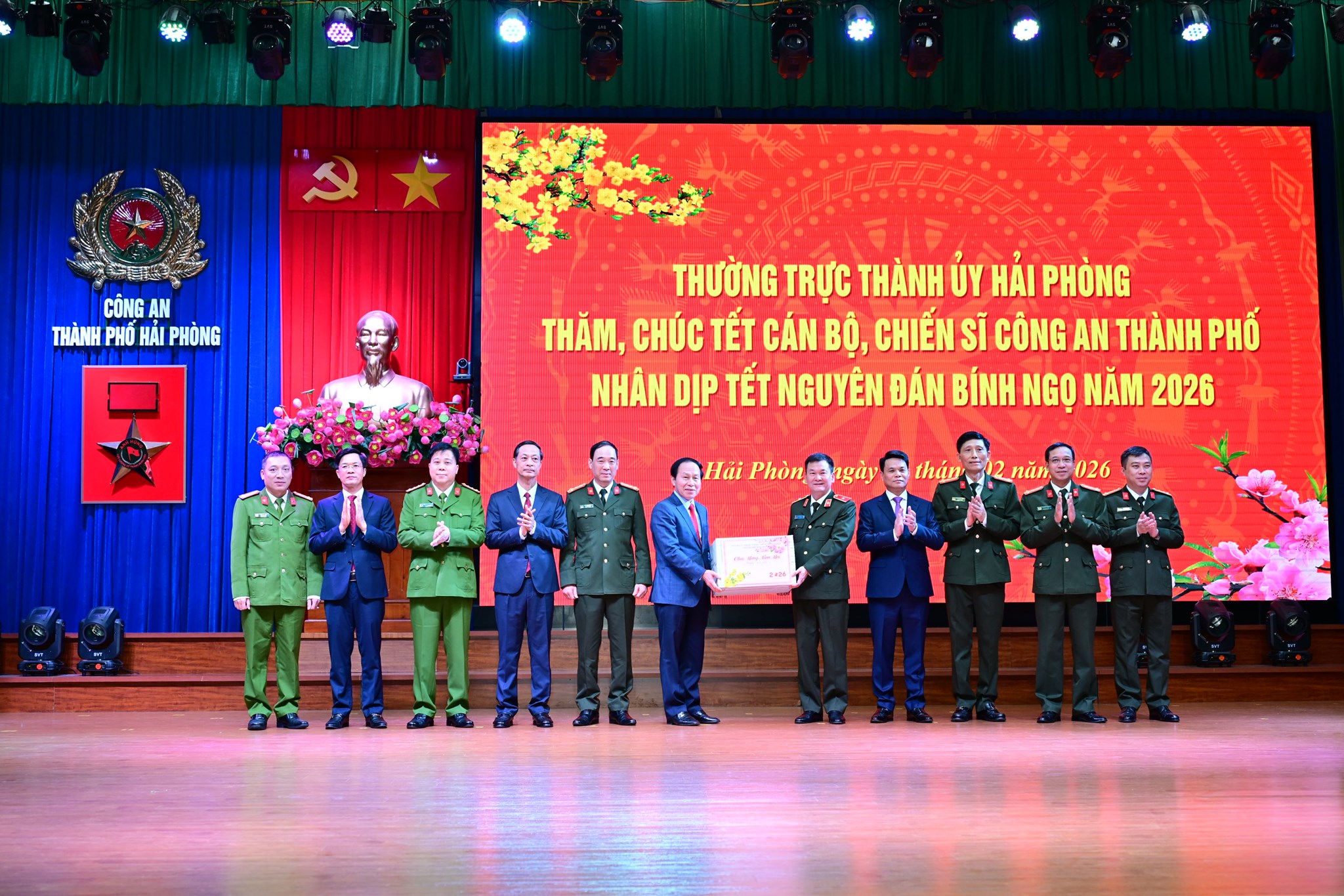 Tối 16/2/2026 (Tức 30 Tết), đoàn đại biểu Thường trực Thành ủy, Hội đồng nhân dân, Ủy ban nhân dân, Ủy ban Mặt trận Tổ quốc Việt Nam Thành phố đến thăm, chúc Tết và động viên cán bộ, chiến sĩ Công an thành phố nhân dịp Xuân Bính Ngọ 2026.