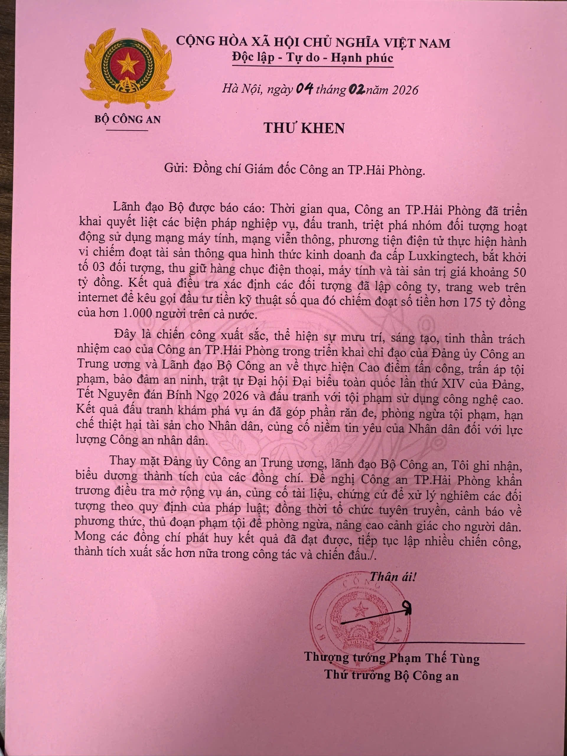 Ngày 04/02/2026, Thượng tướng Phạm Thế Tùng, Ủy viên Trung ương Đảng, Thứ trưởng Bộ Công an đã có Thư khen gửi Công an TP Hải Phòng ghi nhận, biểu dương thành tích xuất sắc trong đấu tranh, triệt phá nhóm đối tượng sử dụng công nghệ cao chiếm đoạt tài sản bằng hình thức kinh doanh đa cấp.