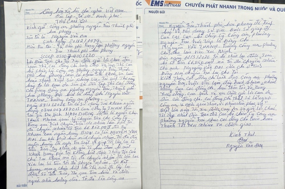 Thư cảm ơn của ông Nguyễn Văn Đại gửi tới Công an phường Nguyễn Trãi