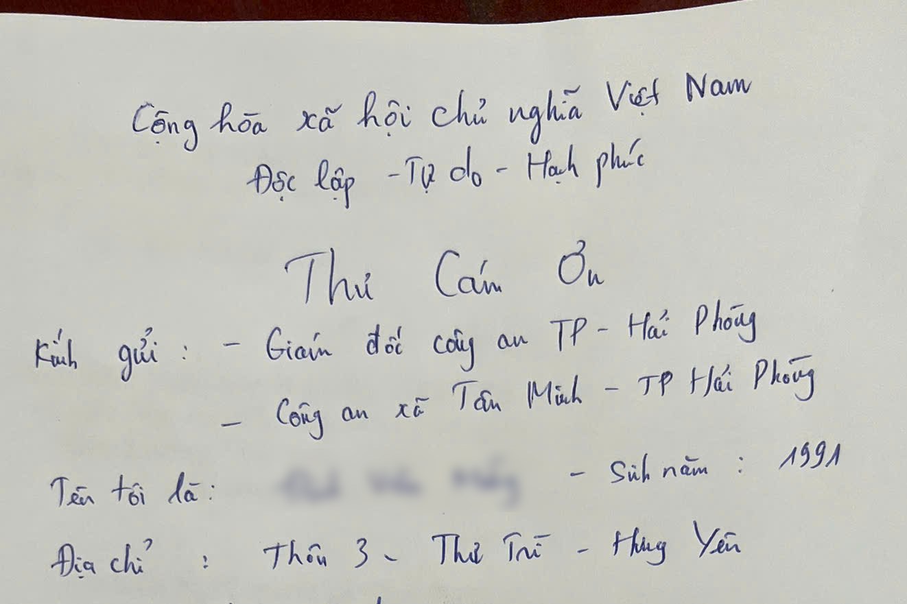 Đến hồi 23h30' ngày 19/4/2026, Công an xã Tân Minh đã hoàn tất thủ tục bàn giao anh Đ.Đ.Q cho gia đình để đưa về chăm sóc. Cảm kích trước sự hỗ trợ kịp thời, gia đình anh Đ.Đ.Q đã viết thư cảm ơn gửi Giám đốc Công an thành phố Hải Phòng và tập thể Công an xã Tân Minh, bày tỏ sự trân trọng sâu sắc đối với tinh thần "Vì Nhân dân phục vụ" của lực lượng Công an.