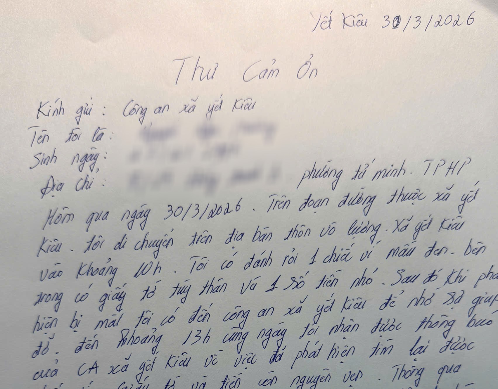 Khoảng 10h30' ngày 30/3/2026, trên đường đi học về tại khu vực Chợ Ty, thôn Trung, xã Yết Kiêu, cháu B.B.D (sinh năm 2016, học sinh lớp 4B, trường Tiểu học Thống Nhất) nhặt được 01 chiếc ví da màu đen bên trong có nhiều tài sản và giấy tờ quan trọng. Ngay sau khi nhặt được, cháu D đã về nhà nhờ bố đưa đến trụ sở Công an xã Yết Kiêu để trình báo và tìm người đánh rơi trả lại.