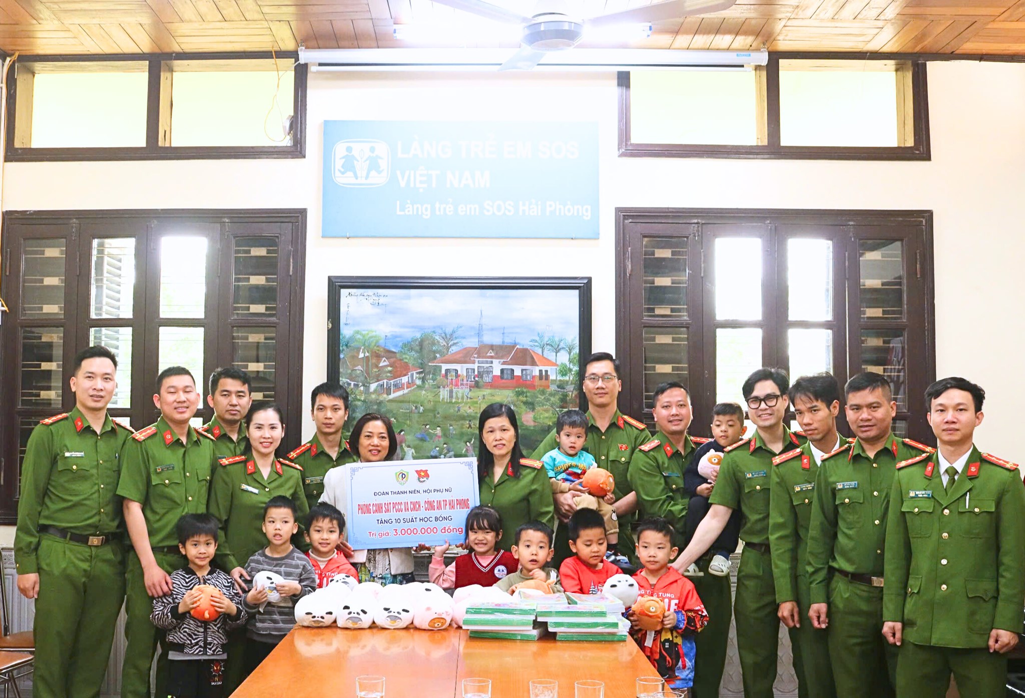 Điểm đến đầu tiên của Đoàn đại biểu là Làng Trẻ em SOS Hải Phòng- “mái nhà chung” hiện đang chăm sóc, nuôi dưỡng 100 trẻ mồ côi, bị bỏ rơi và không may mất đi sự chăm sóc của cha mẹ. Tại đây, Đoàn cơ sở và Hội Phụ nữ Phòng Cảnh sát PCCC và CNCH đã trao tặng 10 suất học bổng, tổng trị giá 3 triệu đồng, cùng nhiều đồ chơi, đồ dùng học tập mới nhằm động viên, khích lệ các em nỗ lực vượt khó, chăm ngoan và học tập tốt.
