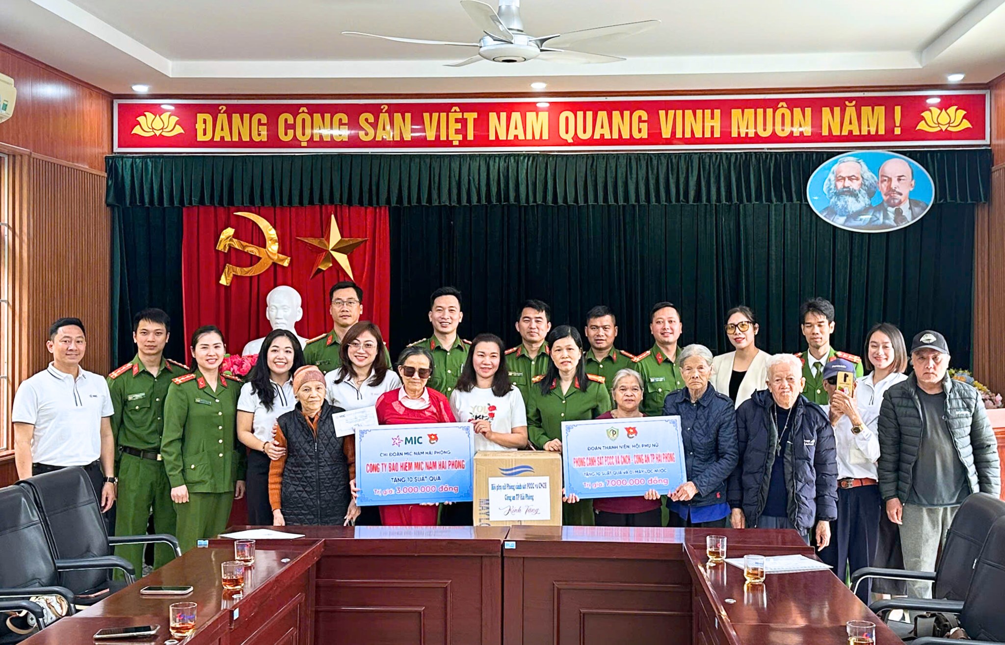 Tiếp đó, Đoàn đến thăm Trung tâm Nuôi dưỡng Bảo trợ xã hội Hải Phòng, nơi đang chăm sóc, nuôi dưỡng nhiều người già neo đơn, người khuyết tật. Tại đây, Đoàn Thanh niên và Hội Phụ nữ Phòng Cảnh sát PCCC và CNCH đã trao 10 suất quà cùng 1 máy lọc nước, tổng trị giá 7 triệu đồng. Bên cạnh đó, Chi đoàn MIC Nam Hải Phòng và Công ty Bảo hiểm MIC Nam Hải Phòng trao tặng 10 suất quà, trị giá 3 triệu đồng.