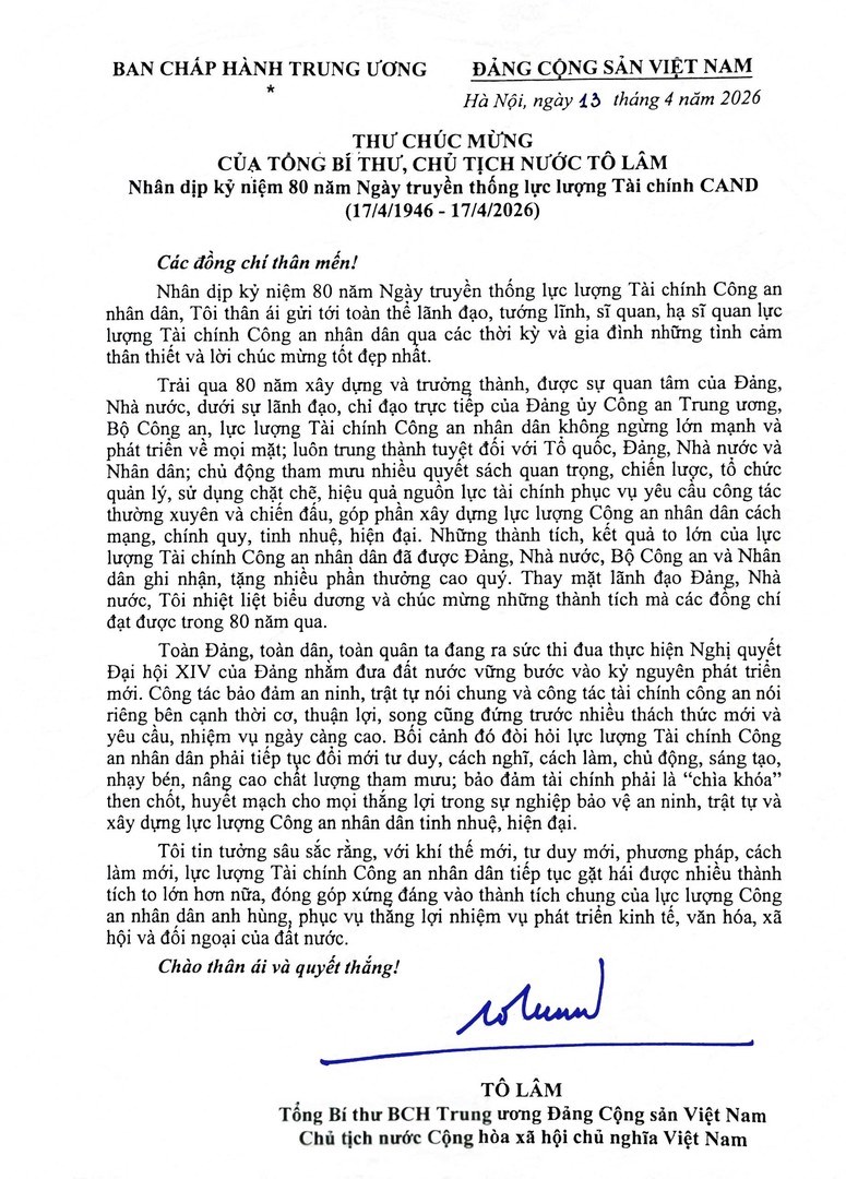 Thư chúc mừng của Tổng Bí thư, Chủ tịch nước Tô Lâm nhân dịp kỷ niệm 80 năm Ngày truyền thống lực lượng Tài chính Công an nhân dân