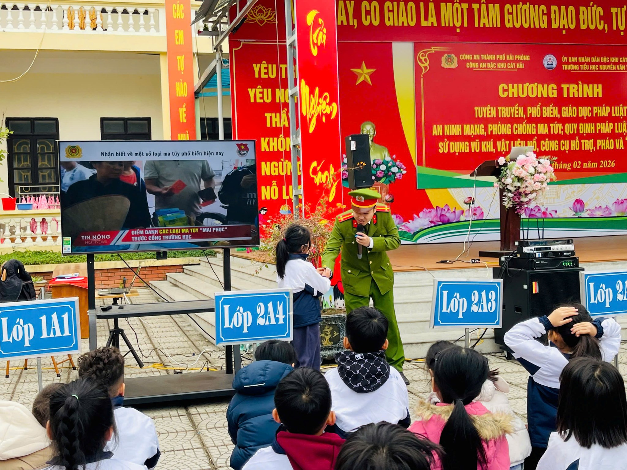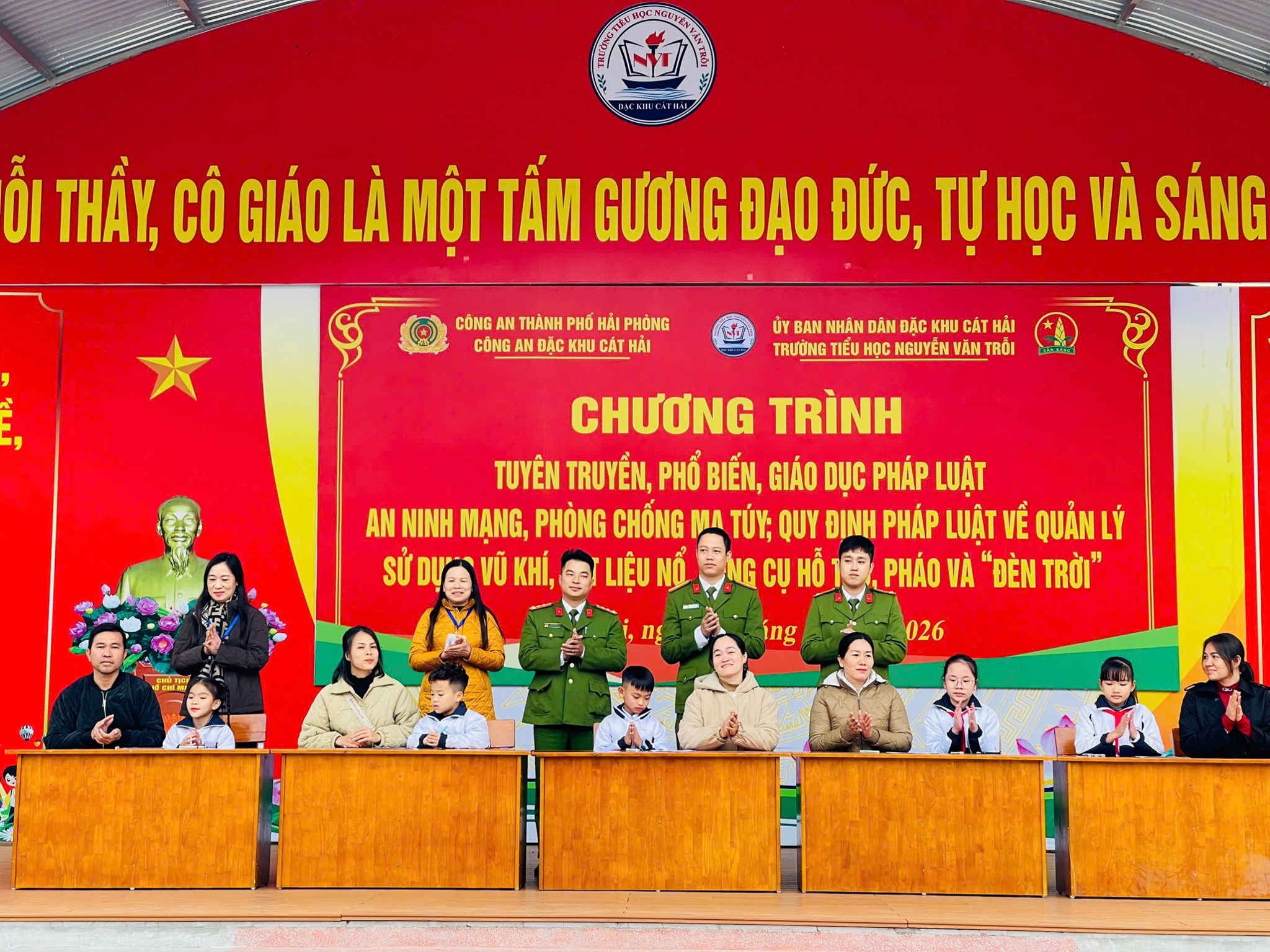 Ngày 09/02/2026, Công an đặc khu Cát Hải tổ chức buổi tuyên truyền về phòng chống tội phạm sử dụng công nghệ cao; phòng chống ma túy; quy định pháp luật về quản lý, sử dụng vũ khí - vật liệu nổ - công cụ hỗ trợ, pháo và “đèn trời” tại Trường Tiểu học Nguyễn Văn Trỗi, Thôn 3 và Thôn 18 đặc khu Cát Hải, Hải Phòng với hơn 800 học sinh và giáo viên tham gia.