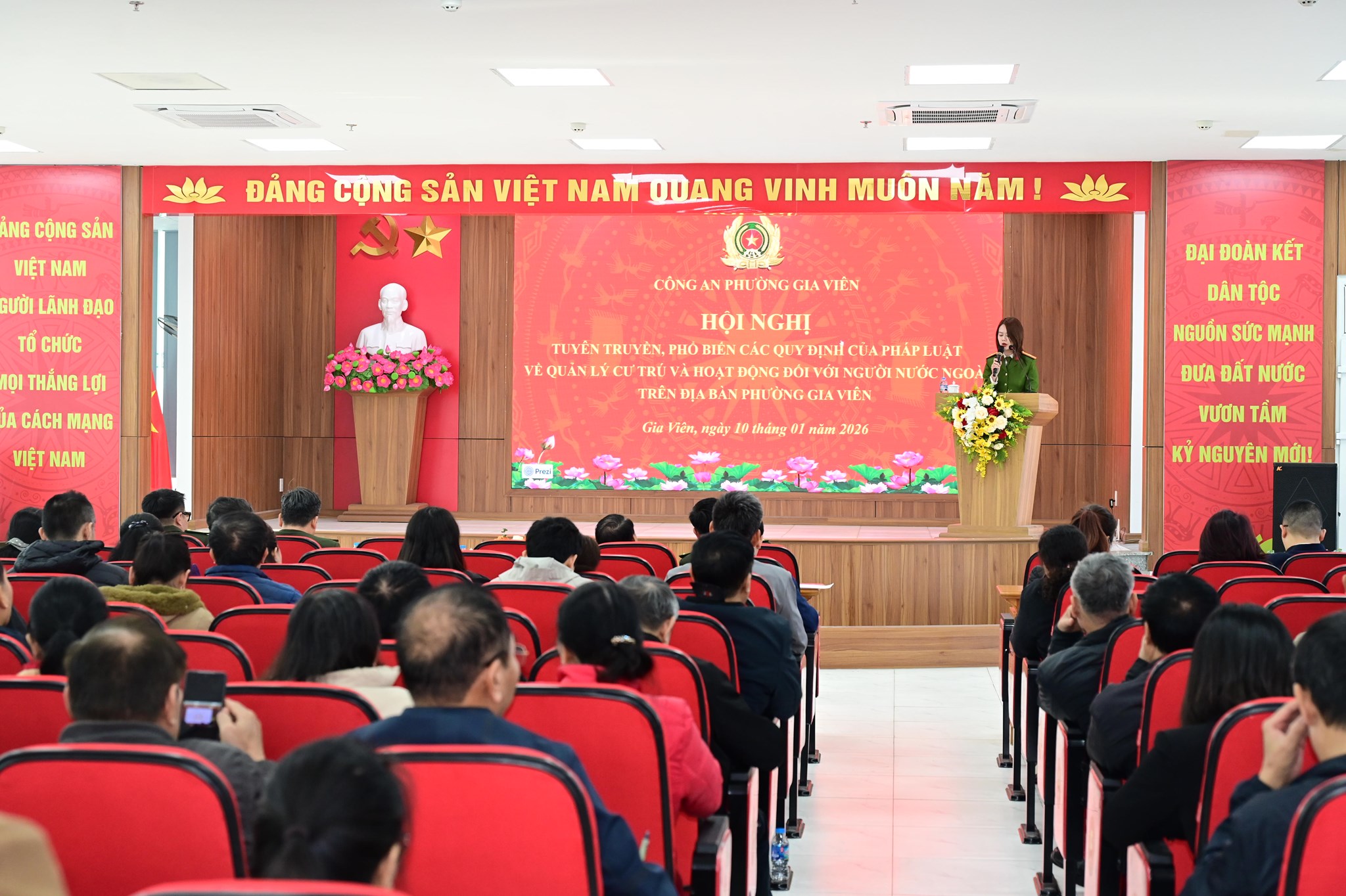 Sáng ngày 10/1/2026, tại trụ sở Đảng uỷ phường Gia Viên, Công an phường Gia Viên tổ chức Hội nghị tuyên truyền, phổ biến, hướng dẫn pháp luật cho 200 đại diện các cơ sở cho người nước ngoài thuê lưu trú ctrên địa bàn phường. Dự hội nghị có đồng chí Nguyễn Chiến Vương, Phó Chủ tịch UBND phường; đại diện lãnh đạo Phòng Quản lý xuất nhập cảnh - CATP cùng đại diện một số phòng, ban, đơn vị liên quan.