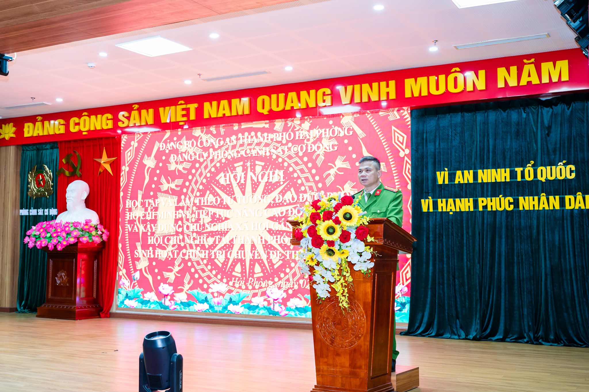 Tại hội nghị, Thượng tá Đào Xuân Bích - Phó Bí thư Đảng ủy, Phó Trưởng phòng Cảnh sát cơ động đã quán triệt đến đảng viên, cán bộ, chiến sĩ đơn vị việc học tập và làm theo tư tưởng, đạo đức, phong cách Hồ Chí Minh, những nội dung, lời dạy của Chủ tịch Hồ Chí Minh đối với Đảng bộ và Nhân dân thành phố Hải Phòng về xây dựng, phát triển thành phố để không ngừng nâng cao đời sống Nhân dân và xây dựng Chủ nghĩa xã hội gắn với con người Xã hội chủ nghĩa. Qua đó nâng cao nhận thức và hành động của đảng, viên, cán bộ, chiến sĩ về việc học tập và làm theo lời Bác, tạo sự đồng thuận của Nhân dân trong thực hiện thắng lợi Nghị quyết Đại hội XIV của Đảng, Nghị quyết Đại hội Đảng bộ thành phố và Nghị quyết Đại hội Đảng bộ Công an thành phố lần thứ I, nhiệm kỳ 2025 - 2030 và các nhiệm vụ phát triển kinh tế - xã hội, bảo đảm quốc phòng, an ninh, đối ngoại của thành phố và của CATP trong năm 2026.