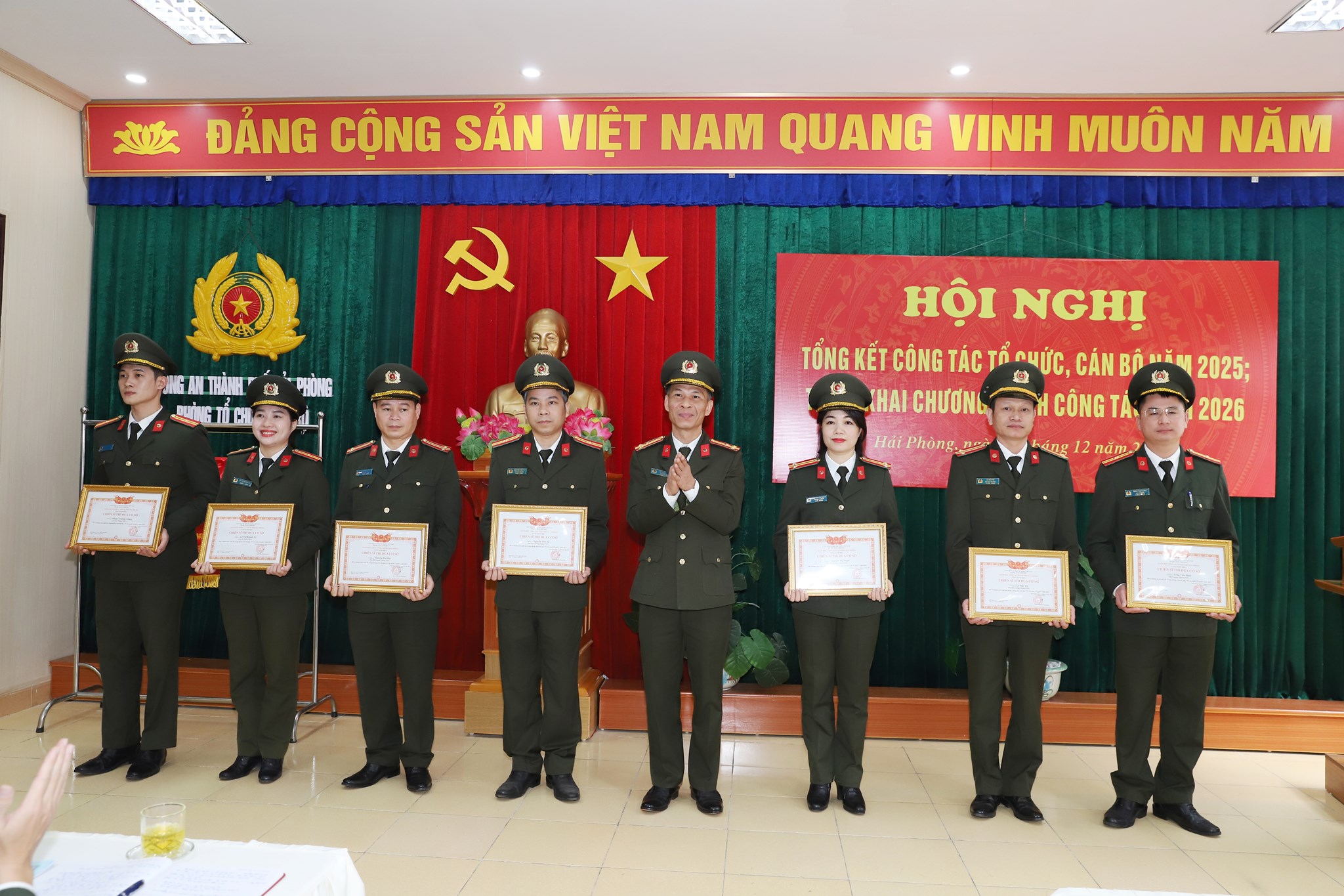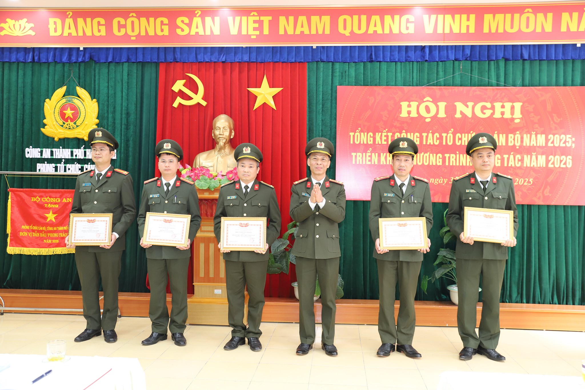 Năm 2025, Đảng ủy, lãnh đạo Phòng Tổ chức cán bộ đã làm tốt công tác tham mưu và thực hiện có trọng tâm, trọng điểm các nhiệm vụ lớn về công tác cán bộ của CATP. Trong đó, đơn vị đã làm tốt công tác tham mưu giúp Đảng ủy - Giám đốc CATP chỉ đạo tổ chức Đại hội Đảng các cấp, nhiệm kỳ 2025 - 2030 trong CATP, đặc biệt là tham mưu giúp lãnh đạo CATP chỉ đạo thực hiện 4 đợt sắp xếp, tổ chức bộ máy của CATP theo chỉ đạo của Đảng ủy CATW, lãnh đạo Bộ Công an và 2 đợt sắp xếp đơn vị hành chính, bảo đảm tinh gọn, hiệu lực, hiệu năng, hiệu quả. Các nội dung, nhiệm vụ công tác tổ chức cán bộ được giao đều được cấp ủy, lãnh đạo Phòng Tổ chức cán bộ thực hiện kịp thời, hoàn thành tốt. CBCS trong đơn vị luôn có tư tưởng vững vàng, yên tâm công tác, tích cực tham gia các hoạt động, phong trào thi đua, đạt hiệu quả công tác cao. Kết thúc thi đua năm 2025, Phòng Tổ chức cán bộ CATP vinh dự được nhận Cờ thi đua của Bộ Công an, được Giám đốc CATP tặng danh hiệu “Đơn vị quyết thắng”.