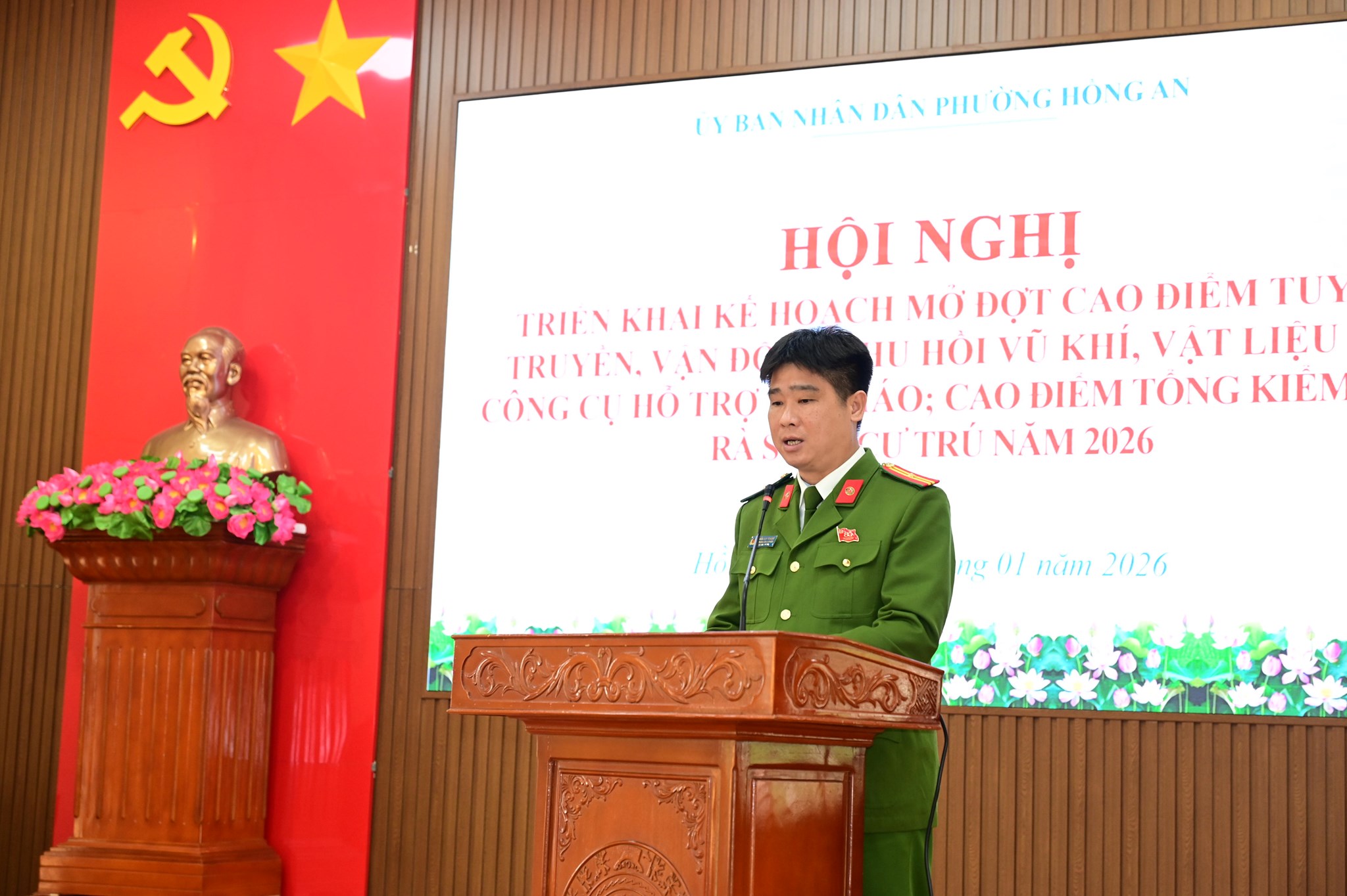 Tại hội nghị, Công an phường Hồng An triển khai các kế hoạch về mở đợt cao điểm tuyên truyền, vận động thu hồi vũ khí, vật liệu nổ, công cụ hỗ trợ và pháo; cao điểm tổng kiểm tra, rà soát cư trú trên địa bàn phường nhằm tăng cường sự lãnh đạo của cấp ủy, chính quyền địa phương và nêu cao tinh thần, trách nhiệm của các cơ quan, đơn vị và nhân dân trong việc thực hiện Luật Quản lý vũ khí, vật liệu nổ, công cụ hỗ trợ và các văn bản hướng dẫn thi hành.