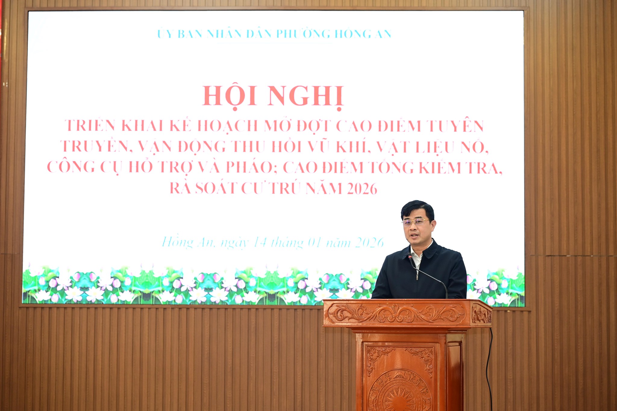 Sáng 14/01/2026, Ủy ban nhân dân phường Hồng An tổ chức hội nghị triển khai đợt cao điểm tuyên truyền, vận động thu hồi vũ khí, vật liệu nổ, công cụ hỗ trợ và pháo; cao điểm tổng kiểm tra, rà soát cư trú trên địa bàn, góp phần bảo đảm ANTT Đại hội đại biểu toàn quốc lần thứ XIV, bầu cử đại biểu Quốc hội, HĐND các cấp, nhiệm kỳ 2026 – 2031 và tết nguyên đán Bính Ngọ. Đồng chí Nguyễn Hữu Thanh, Phó Bí thư Đảng ủy, Chủ tịch UBND phường Hồng An dự, chỉ đạo hội nghị; cùng dự có đồng chí Vũ Quang Tuân, Chủ tịch Ủy ban MTTQ phường Hồng An.