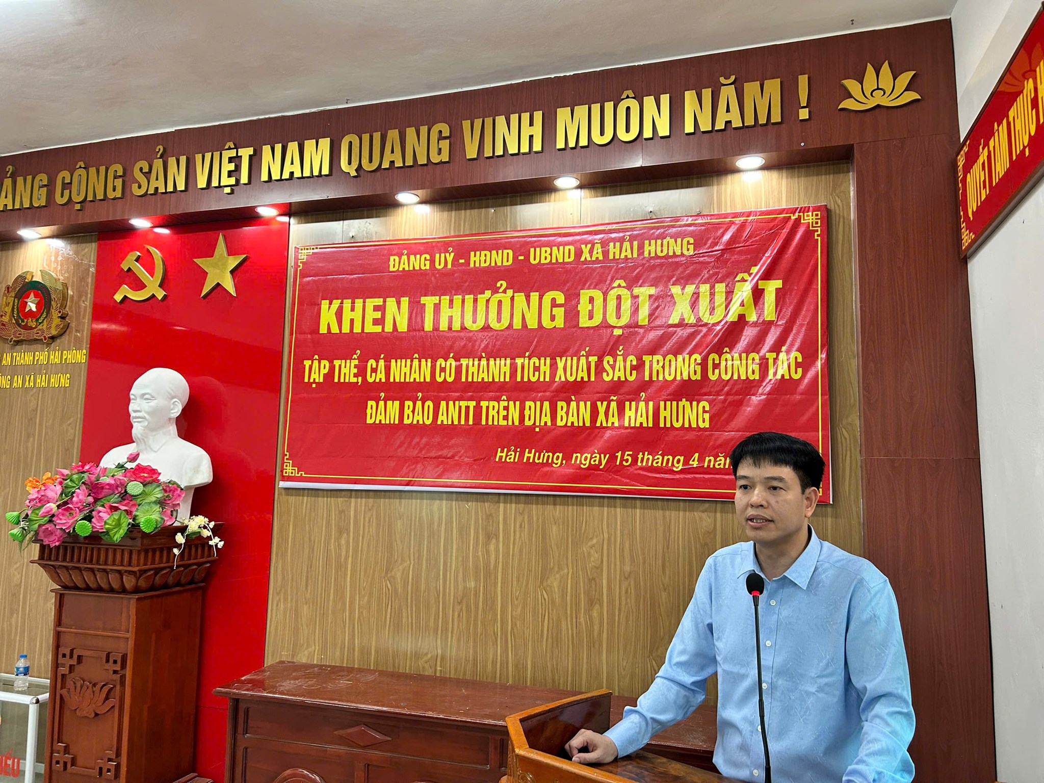 Ghi nhận thành tích này, UBND xã Hải Hưng đã trao tặng Giấy khen đột xuất cho tập thể Công an xã Hải Hưng và 03 cá nhân trực tiếp tham gia phá án. Phát biểu chỉ đạo, đồng chí Bùi Văn Kiên – Phó Chủ tịch UBND xã ghi nhận, biểu dương tinh thần trách nhiệm, kiên quyết tấn công tội phạm của lực lượng Công an xã. Đồng chí yêu cầu trong thời gian tới, đơn vị tiếp tục phát huy kết quả đạt được, chủ động nắm chắc tình hình, giữ vững an ninh chính trị và trật tự an toàn xã hội, bảo đảm cuộc sống bình yên cho Nhân dân./.