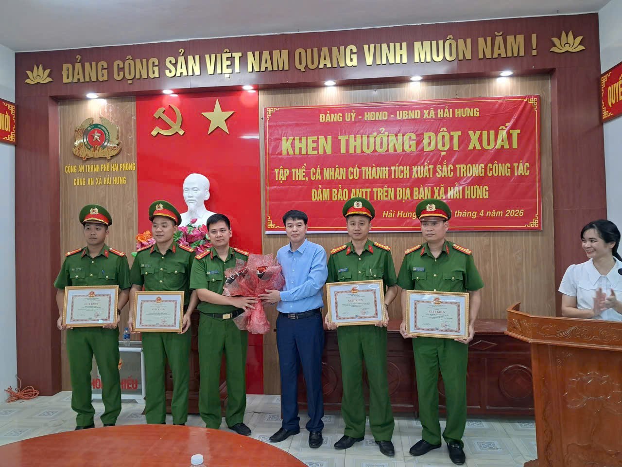 Nội dung khen thưởng xuất phát từ thành tích khám phá nhanh vụ gây rối trật tự công cộng xảy ra vào ngày 05/04/2026. Thời điểm trên, một nhóm 11 đối tượng đeo khẩu trang, điều khiển xe máy tháo biển số, dùng vỏ chai bia tấn công người đi đường tại xã Hải Hưng, khiến 03 người bị thương (trong đó có 01 nạn nhân gãy xương bả vai). Ngay sau khi nhận tin báo, Công an xã Hải Hưng đã huy động lực lượng, tập trung rà soát và xác minh đối tượng. Kết quả, chưa đầy 24 giờ kể từ khi vụ việc xảy ra, Công an xã Hải Hưng đã triệu tập toàn bộ 11 đối tượng về trụ sở để đấu tranh làm rõ, đồng thời thu giữ 04 xe máy cùng các tang vật liên quan.