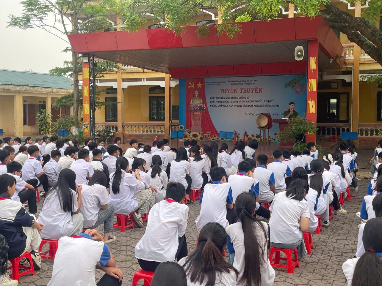 Sáng ngày 20/04/2026, tại Trường THCS Thượng Vũ, Tổ Cảnh sát khu vực (CSKV) - Công an xã Lai Khê phối hợp với nhà trường tổ chức buổi tuyên truyền, phổ biến kiến thức về phòng cháy, chữa cháy (PCCC), cứu nạn, cứu hộ (CNCH) và phòng, chống tai nạn đuối nước. Tham gia buổi tuyên truyền có 483 cán bộ, giáo viên và học sinh nhà trường.