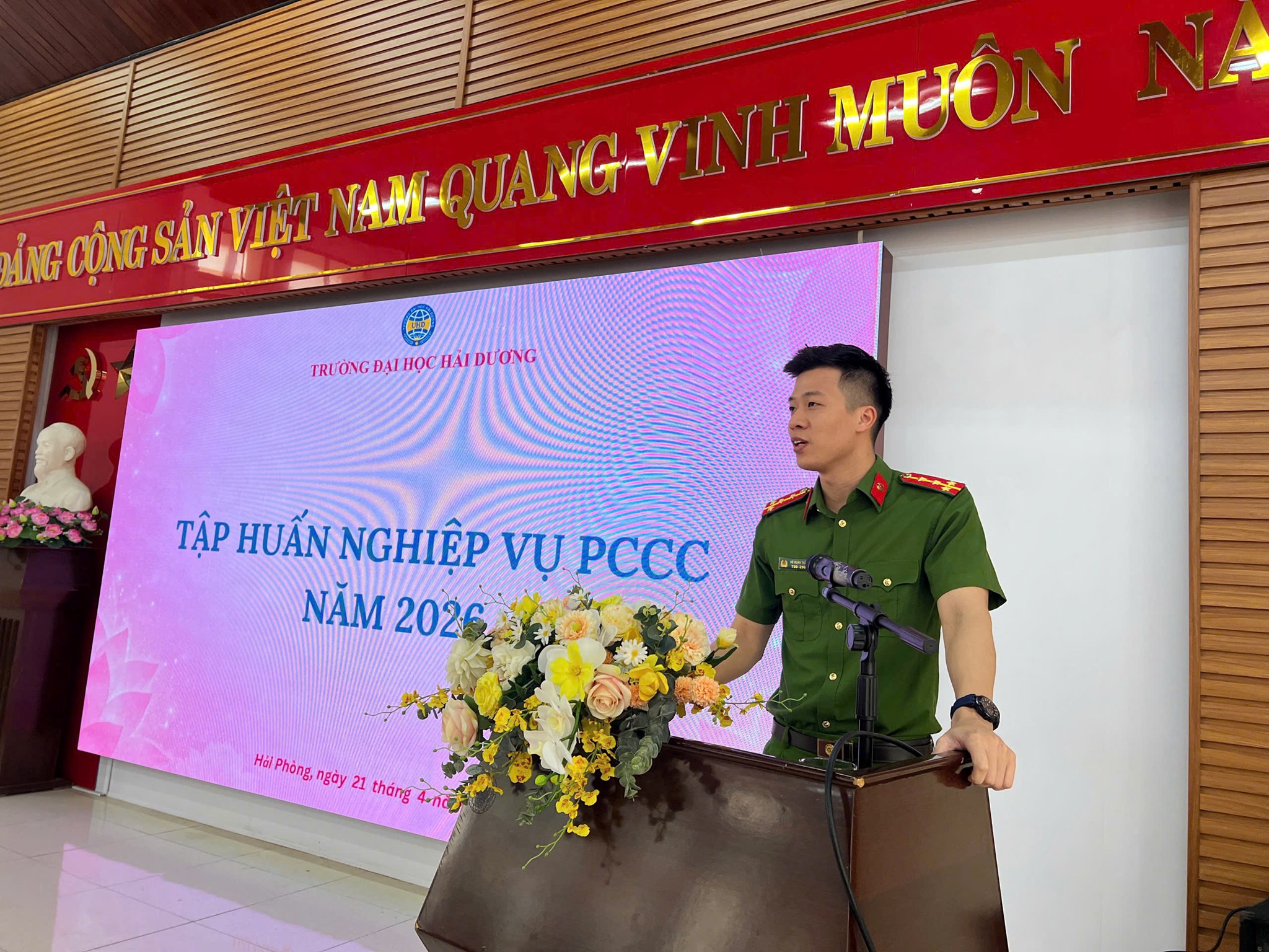 Trong hai ngày 19 và 20/4/2026, Phân đội Lê Thanh Nghị thuộc Đội Chữa cháy và cứu nạn, cứu hộ khu vực 8 (Phòng Cảnh sát PCCC và CNCH) phối hợp với Trường Đại học Hải Dương tổ chức đợt huấn luyện nghiệp vụ phòng cháy, chữa cháy và cứu nạn, cứu hộ. Chương trình được tổ chức cho 120 thành viên thuộc đội PCCC cơ sở của nhà trường tại số 42 Nguyễn Thị Duệ, Phường Lê Thanh Nghị, thành phố Hải Phòng.